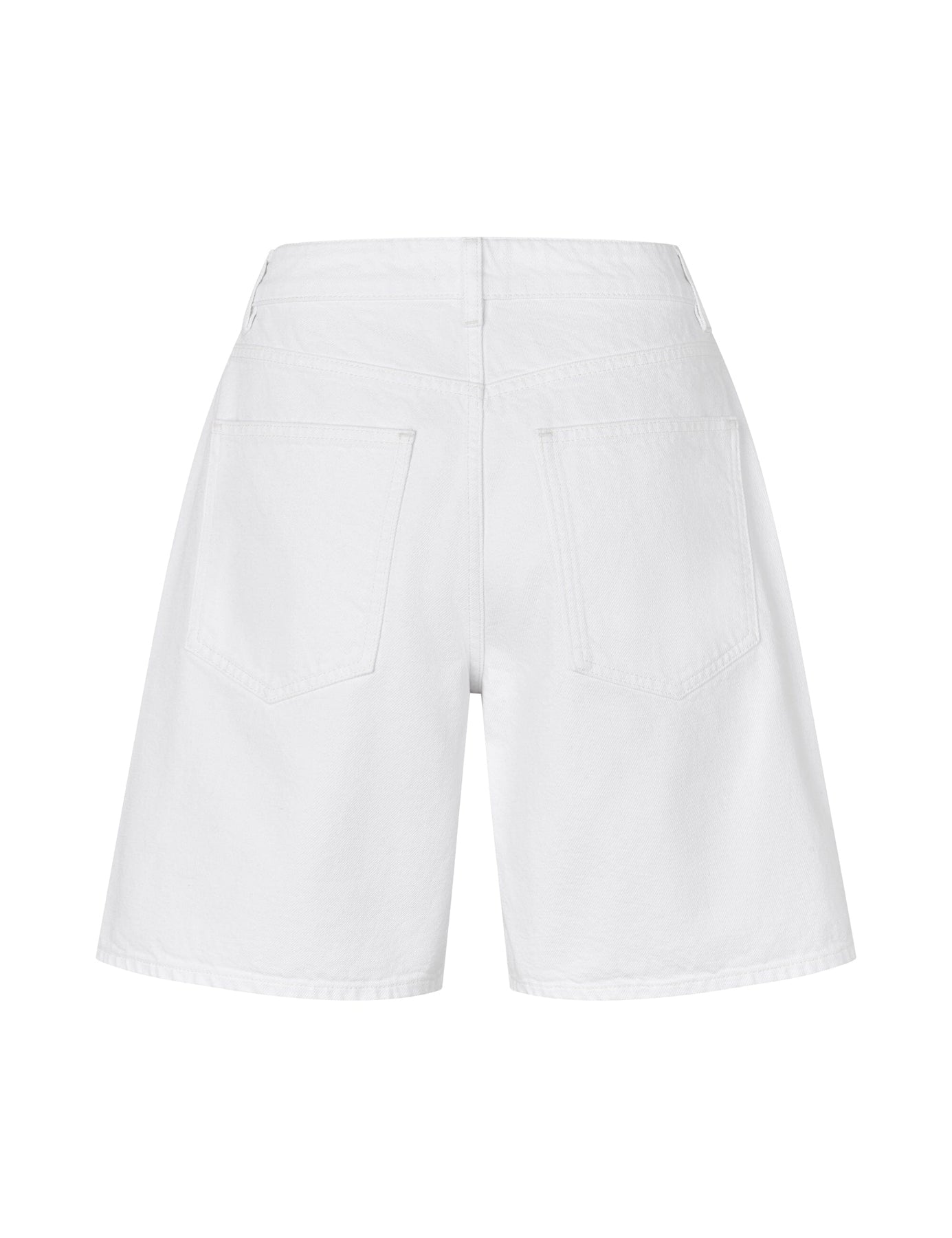Short blanc MbyM à taille haute et longueur genou. Le short présente une coupe ample et se ferme avec une fermeture éclair et des boutons.