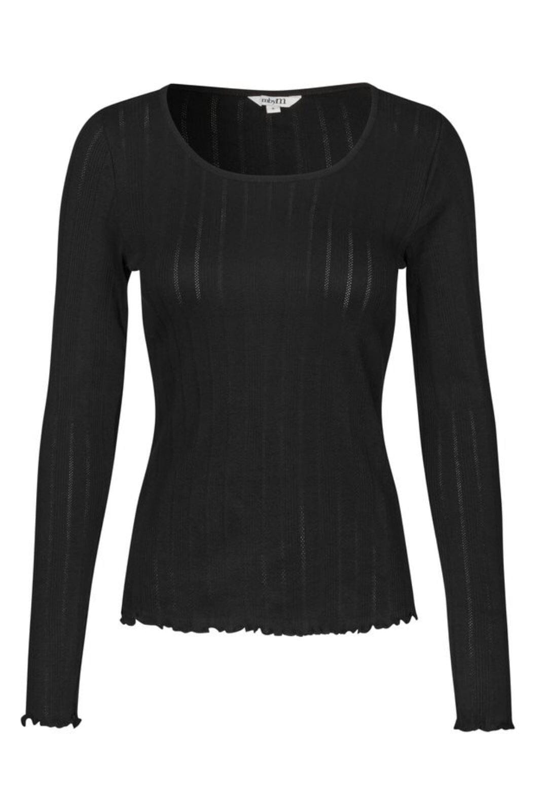 Top à manches longues noire de MbyM avec texture côtelée et volants. Le top a un col rond et une coupe ajustée avec des rayures verticales dans le tissu.