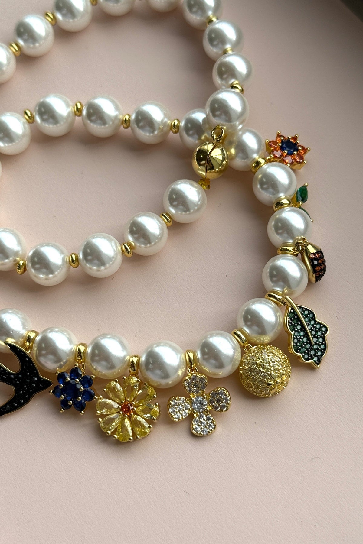 Collier doré de Mellow Moon avec des perles blanches et des charms colorés. Le collier a des éléments décoratifs tels que des fleurs et des oiseaux dans différentes couleurs.