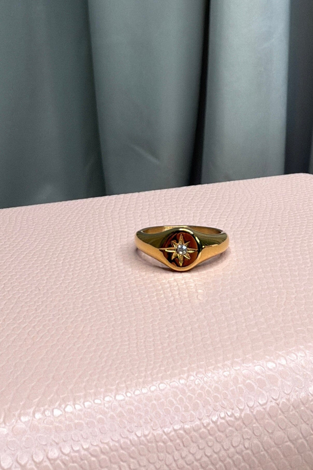 Bague dorée de Mellow Moon avec un motif d'étoile et une petite pierre précieuse au centre. La surface polie donne à la bague une expression brillante.