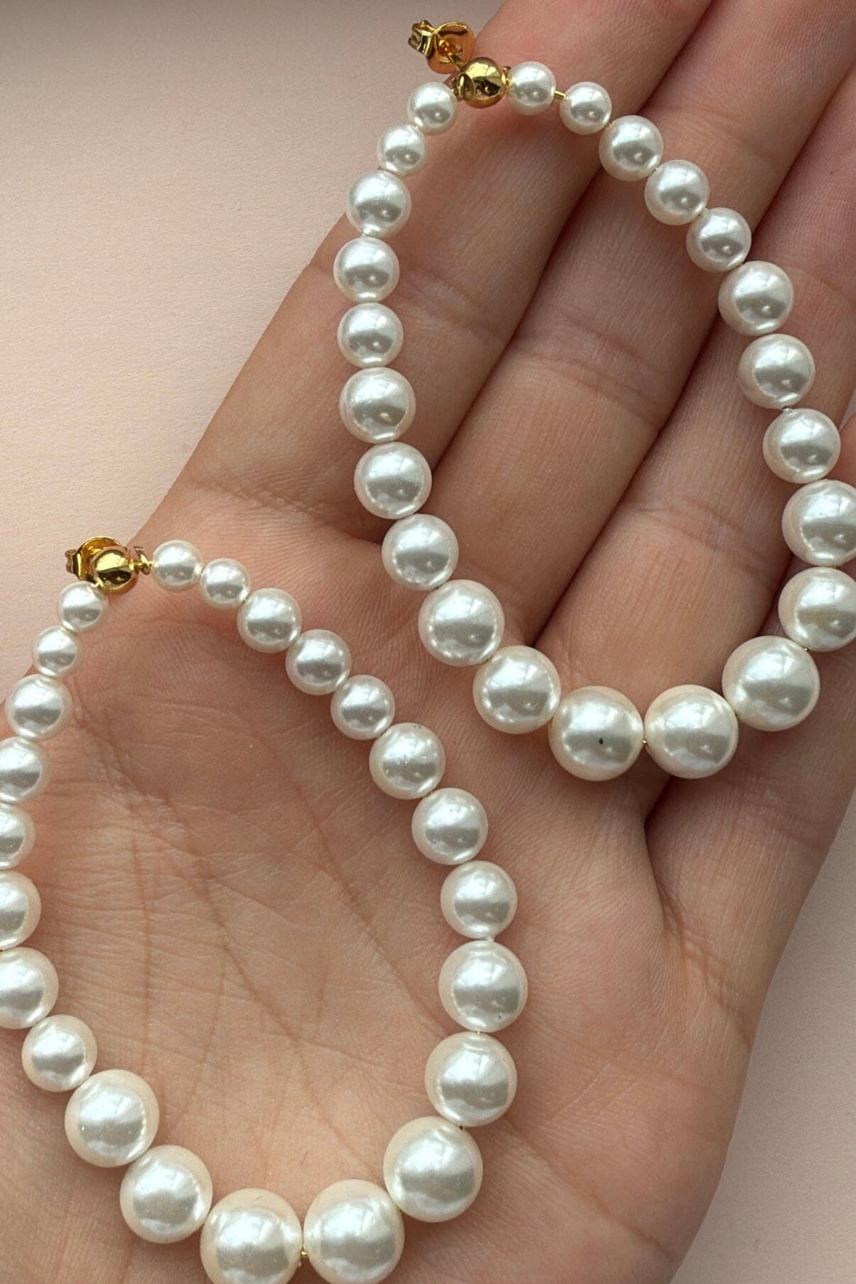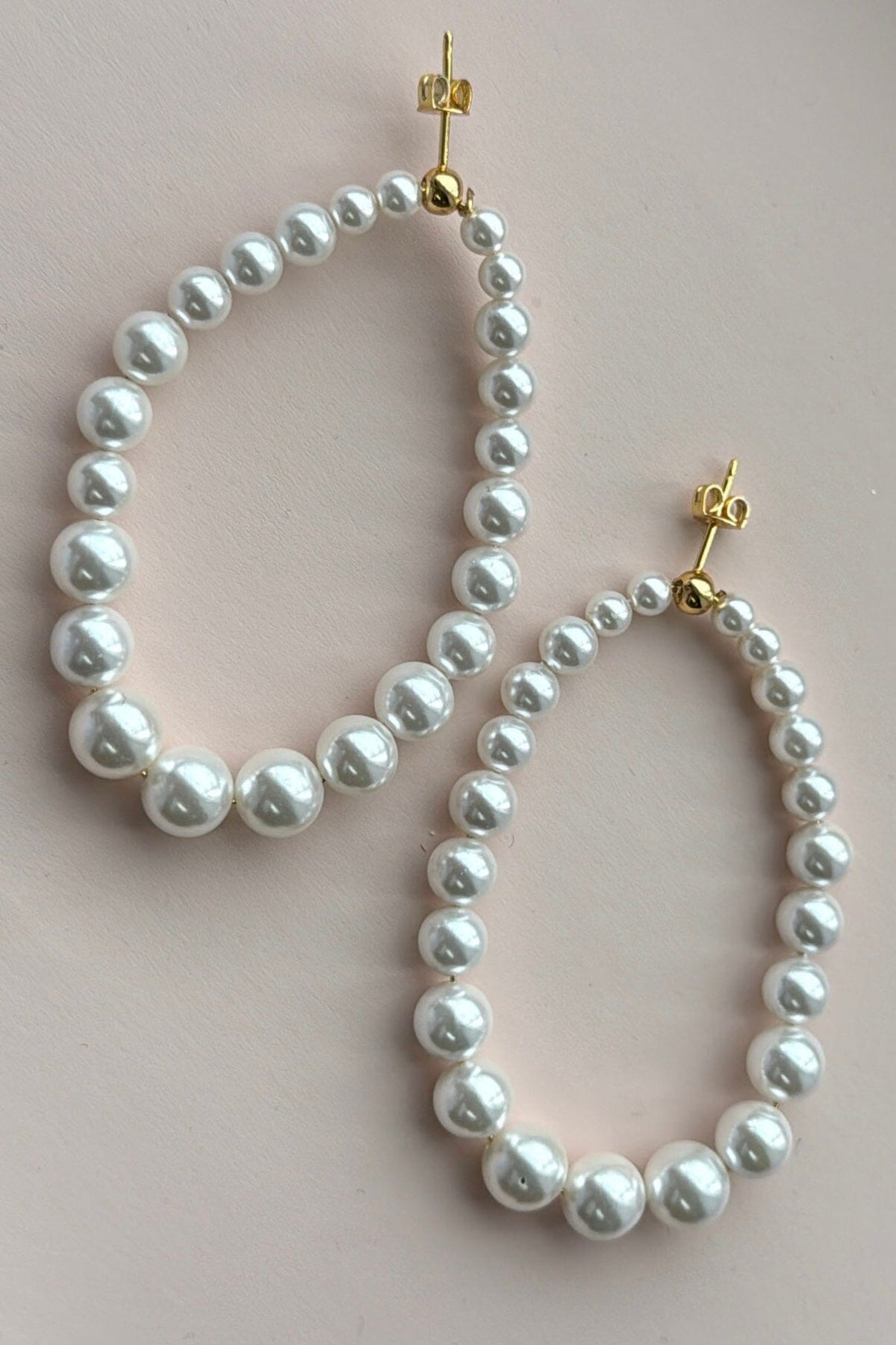 Grandes boucles d'oreilles en perles de Mellow Moon avec des détails dorés. Les boucles d'oreilles ont des perles de différentes tailles assemblées en forme de goutte avec une teinte blanche et crème.