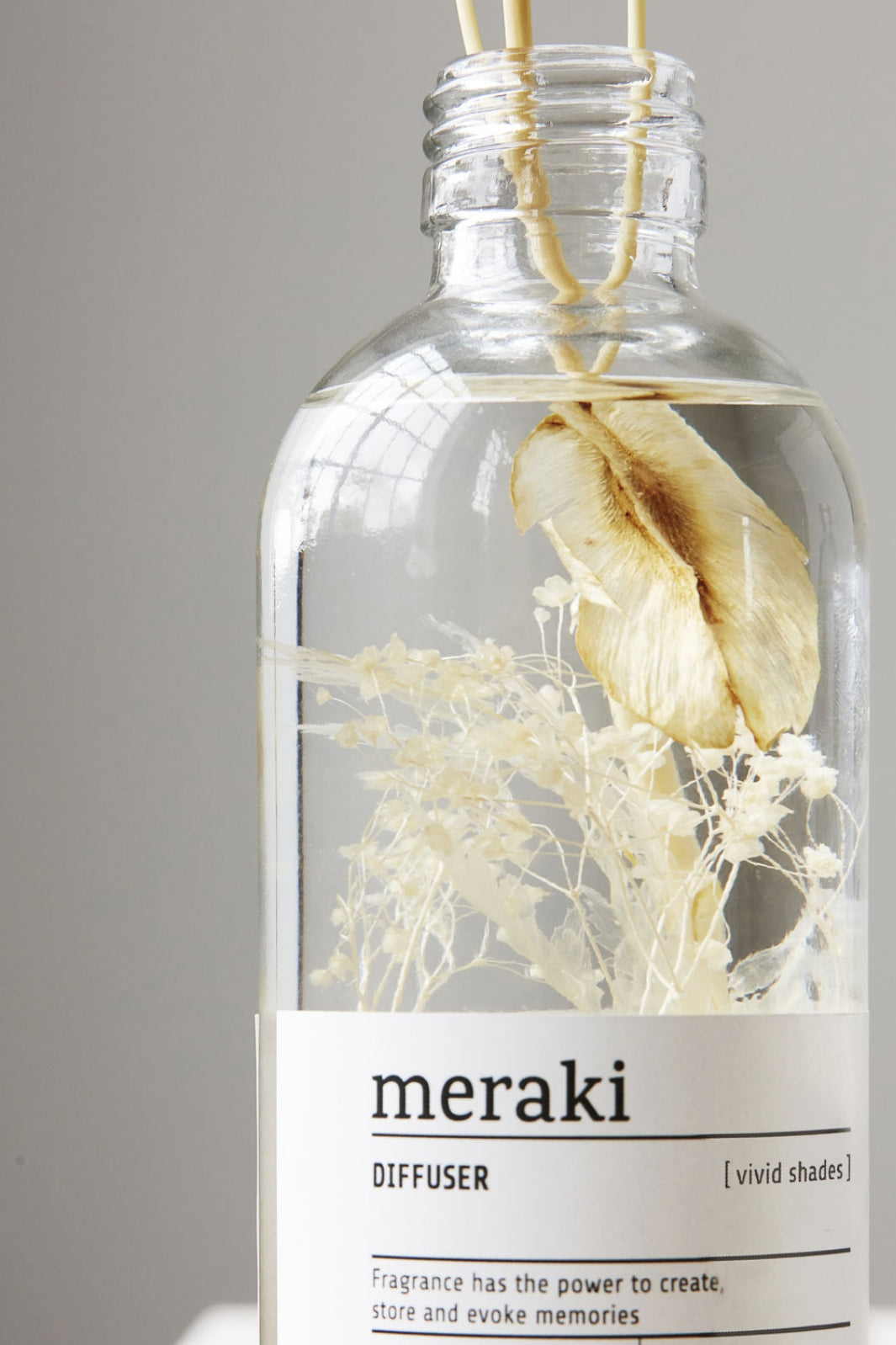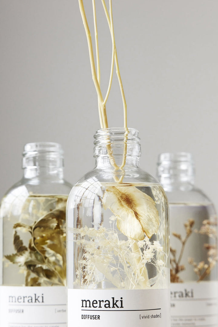 Un diffuseur de parfum de Meraki avec des fleurs séchées et des bâtonnets en bois dans une bouteille en verre transparent. La bouteille contient 240 ml de liquide parfumé avec des notes fraîches et florales.