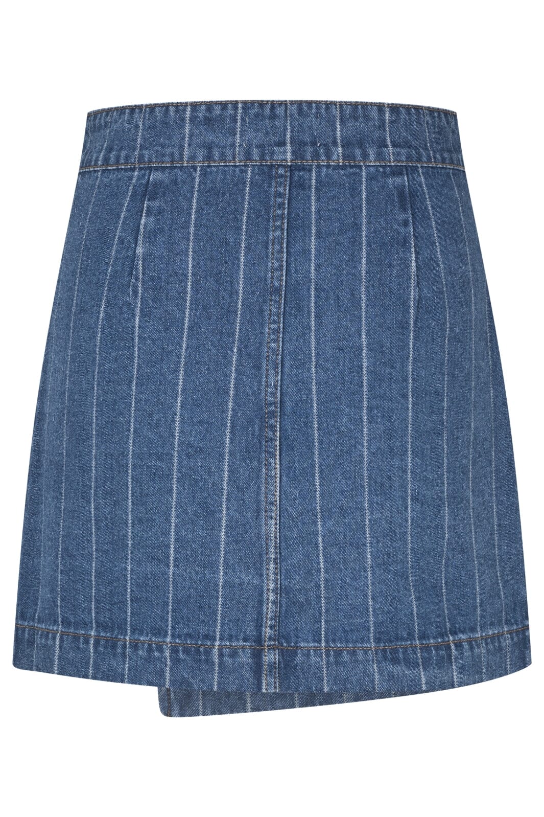 Jupe en denim de Modström avec des rayures jacquard et une fermeture oblique. Elle a un bouton à la taille et une coupe asymétrique qui donne à la jupe une expression distinctive.