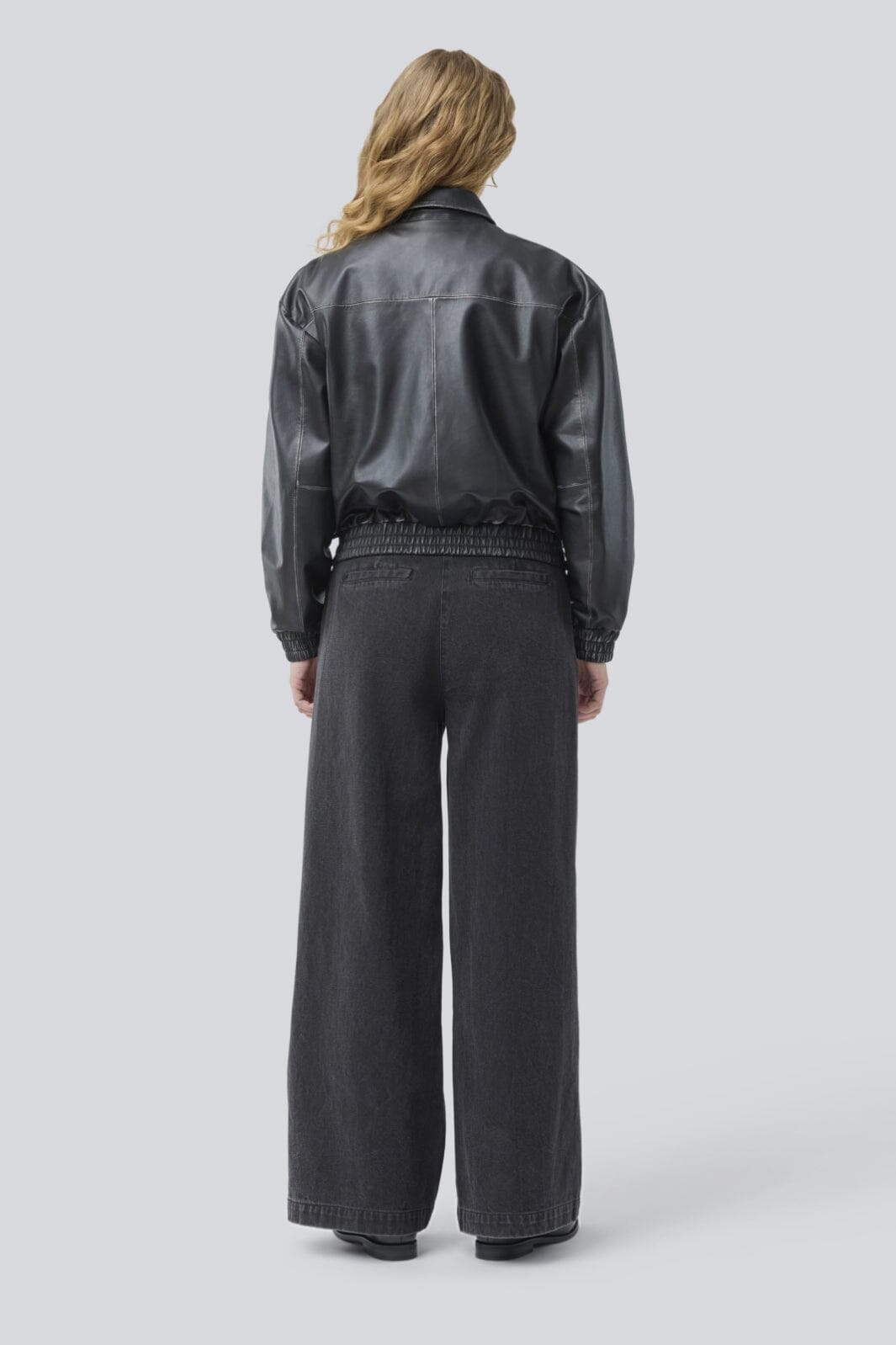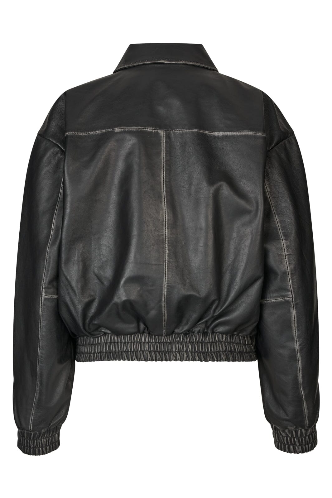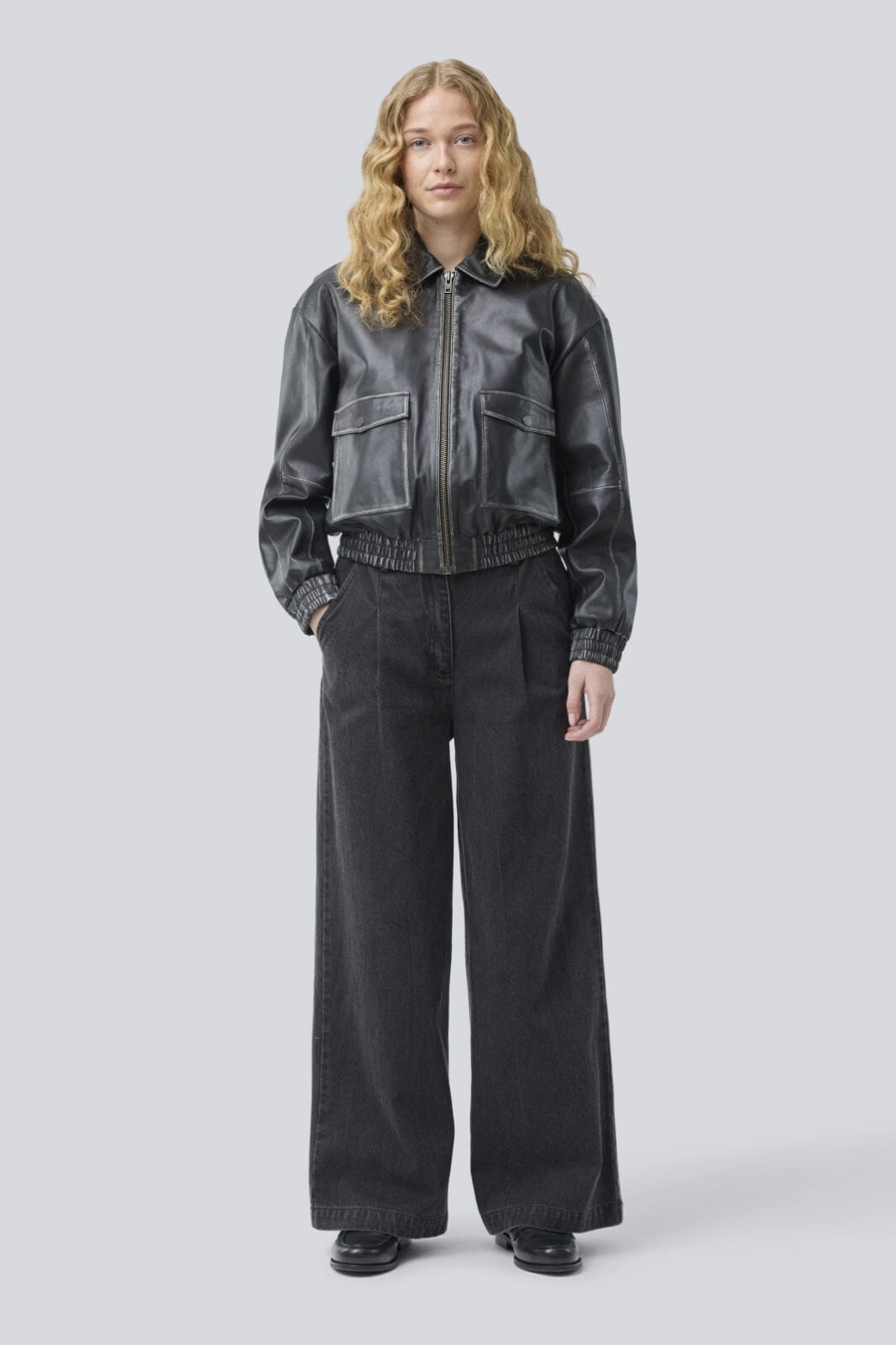Veste en cuir noire de Modström avec col chemise et fermeture éclair à l'avant. La veste a une coupe oversized et deux grandes poches avant avec fermeture à bouton sur le devant.