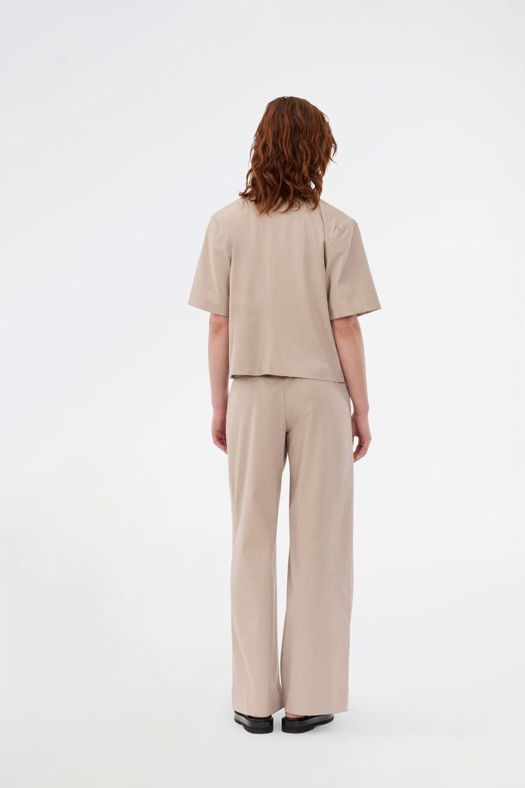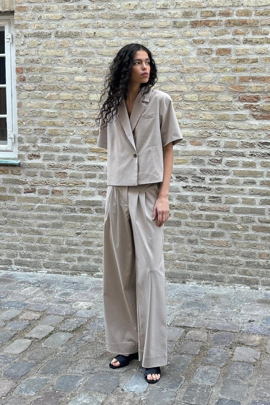 Blazer à manches courtes de Modström, beige avec une texture chinée. Le blazer possède un col chemise, une fermeture boutonnée et une coupe ample.