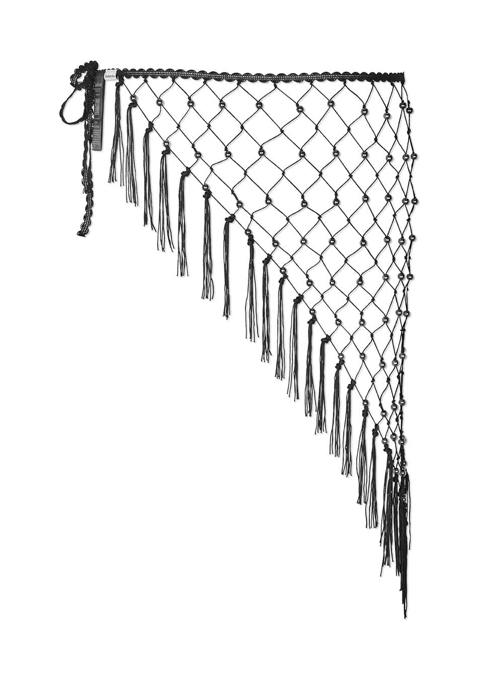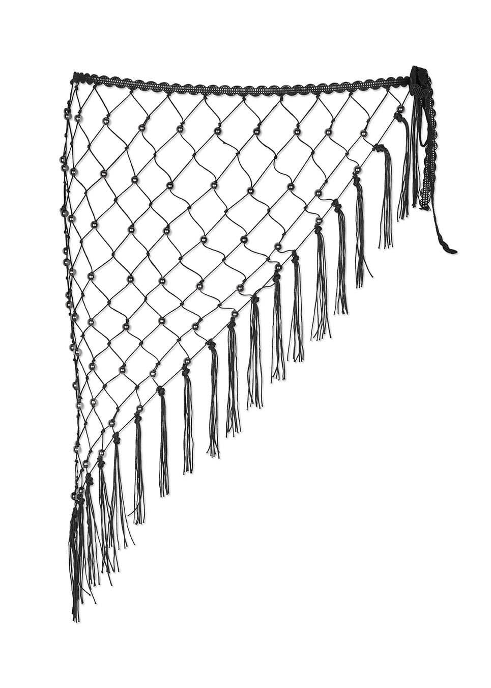 Ceinture foulard noire de Modström, en nylon. Le foulard présente des décorations façon perles dans un motif quadrillé et des franges le long du bord.