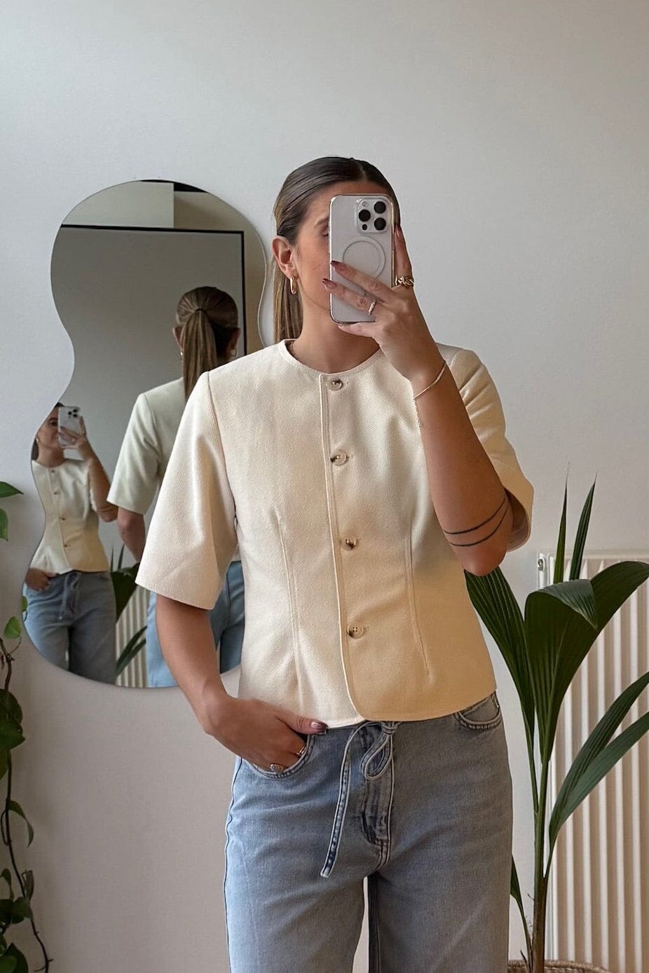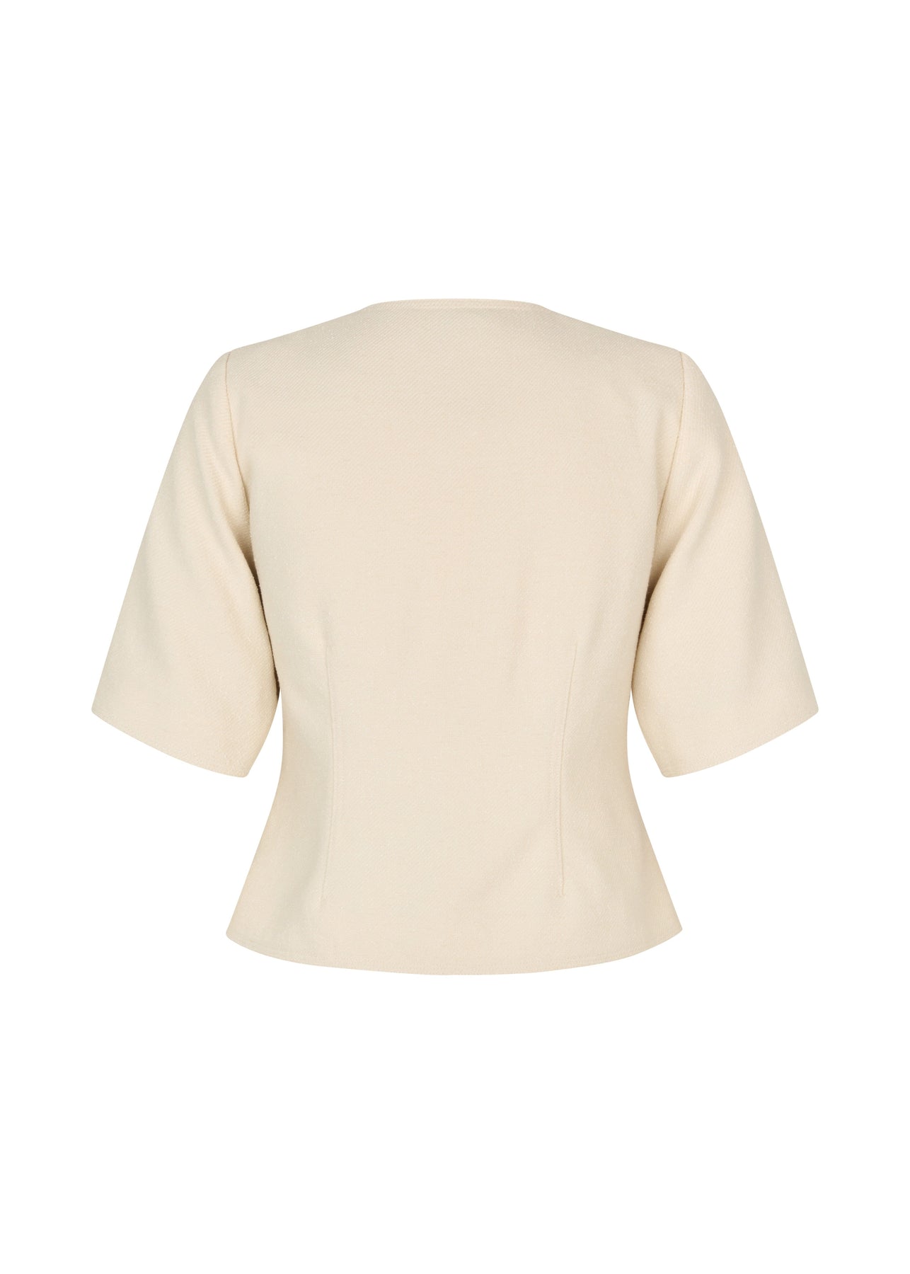 Blazer à manches courtes de Modström, couleur Vanilla Cream. Le blazer présente une encolure ronde et se ferme par des boutons sur le devant.