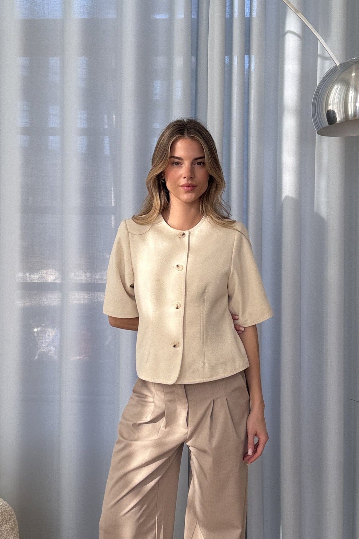 Blazer à manches courtes de Modström, couleur Vanilla Cream. Le blazer présente une encolure ronde et se ferme par des boutons sur le devant.