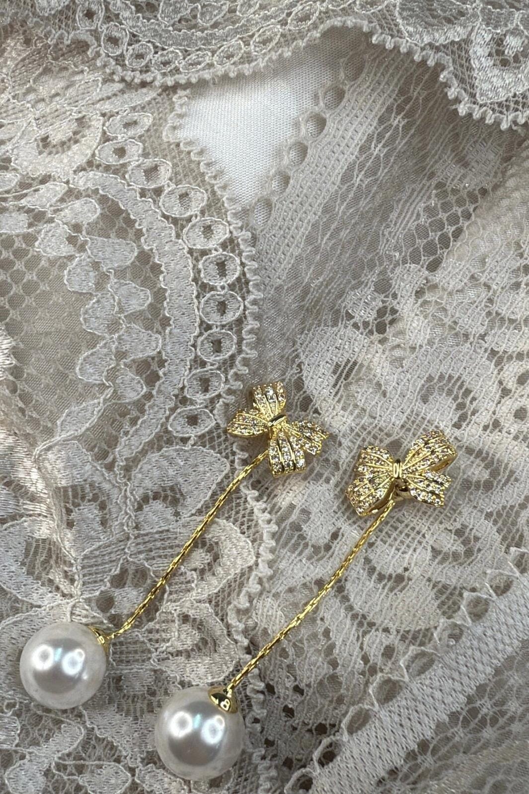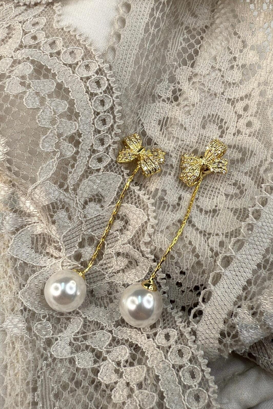 Boucles d’oreilles Molly&My Jewellery avec un design en forme de nœud. Chaque boucle d’oreille comporte de petites pierres scintillantes sur le nœud et une perle ronde en nacre.