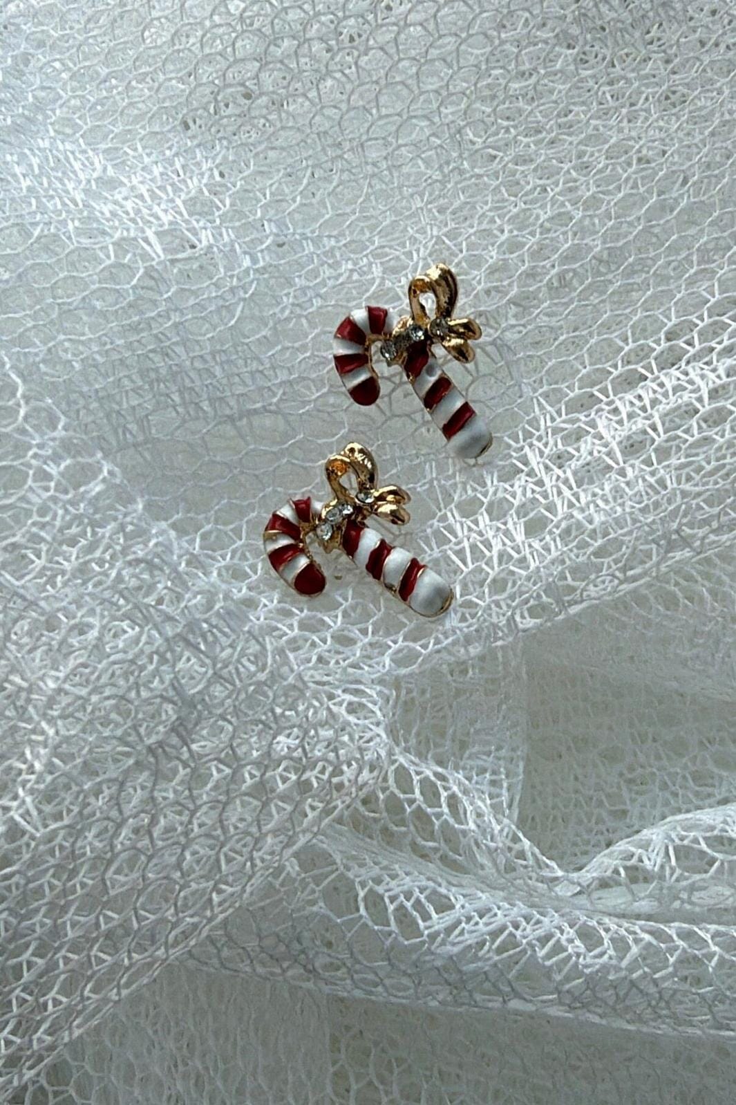 Boucles d’oreilles Molly&My Jewellery conçues comme des cannes de sucre d’orge à rayures rouges et blanches. Elles sont ornées d’un petit nœud doré et d’une pierre transparente.