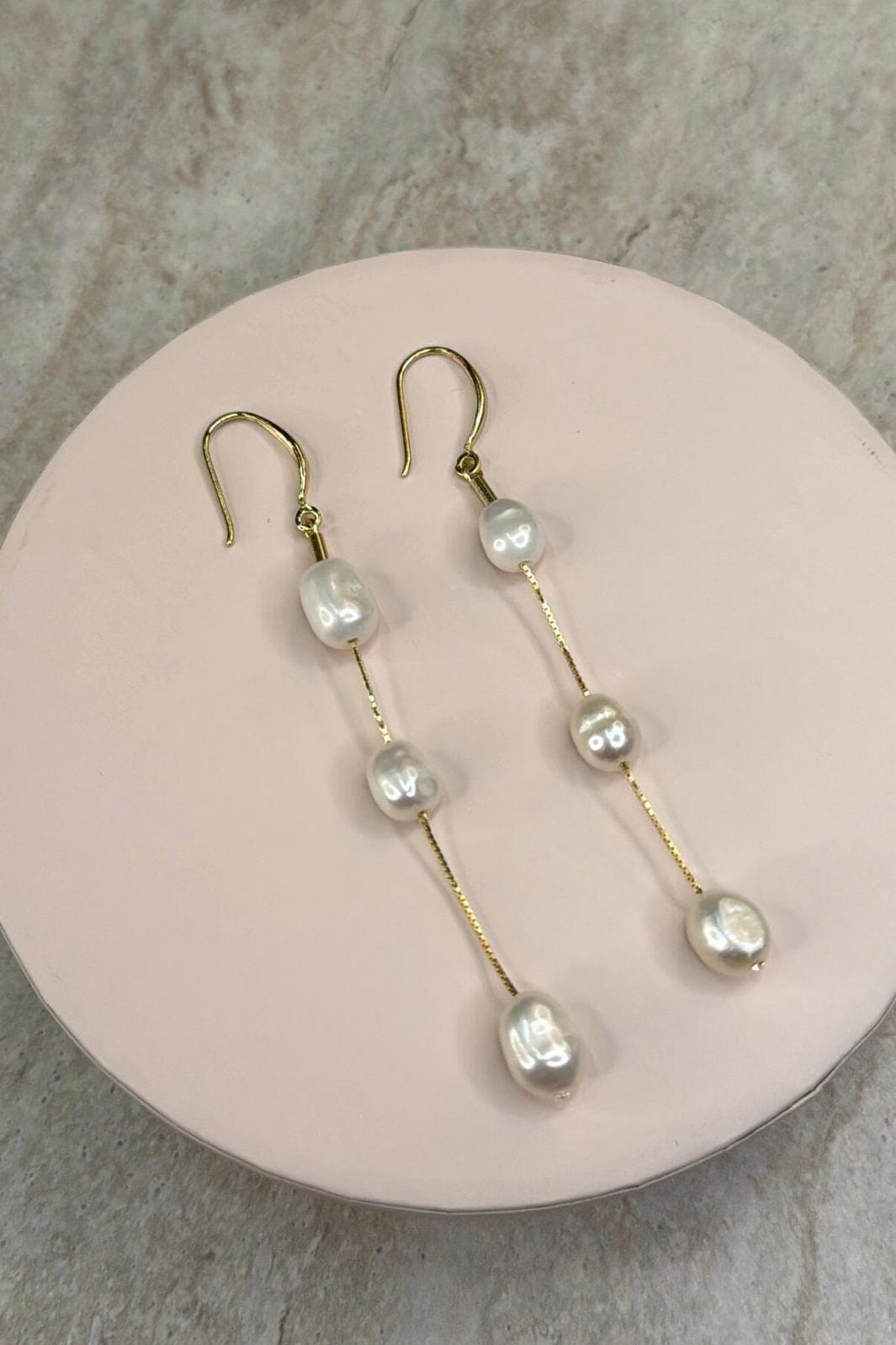 Boucles d’oreilles Molly&My Jewellery avec trois perles d’eau douce blanches et ovales reliées par une fine chaîne dorée sur chaque boucle.