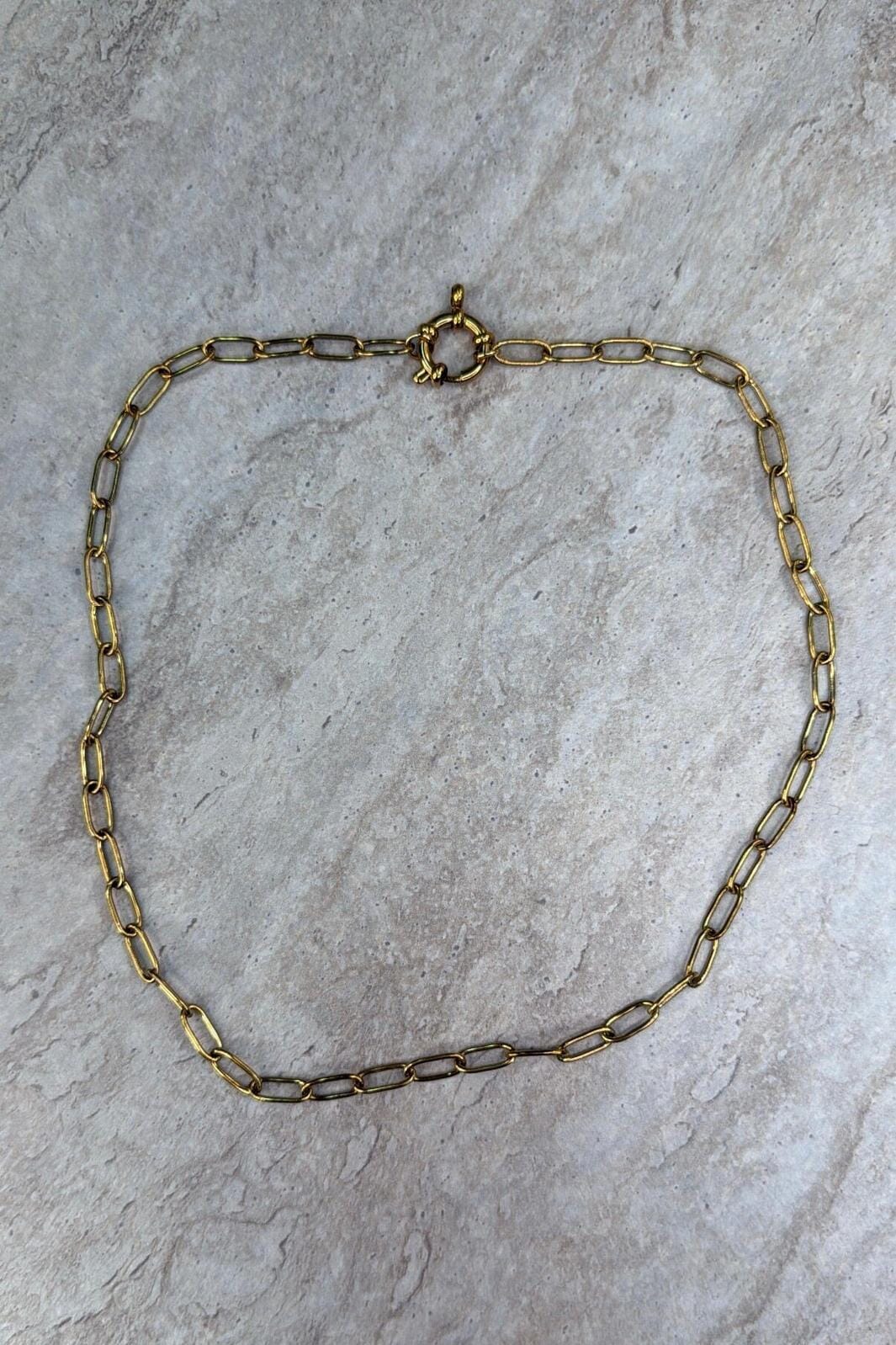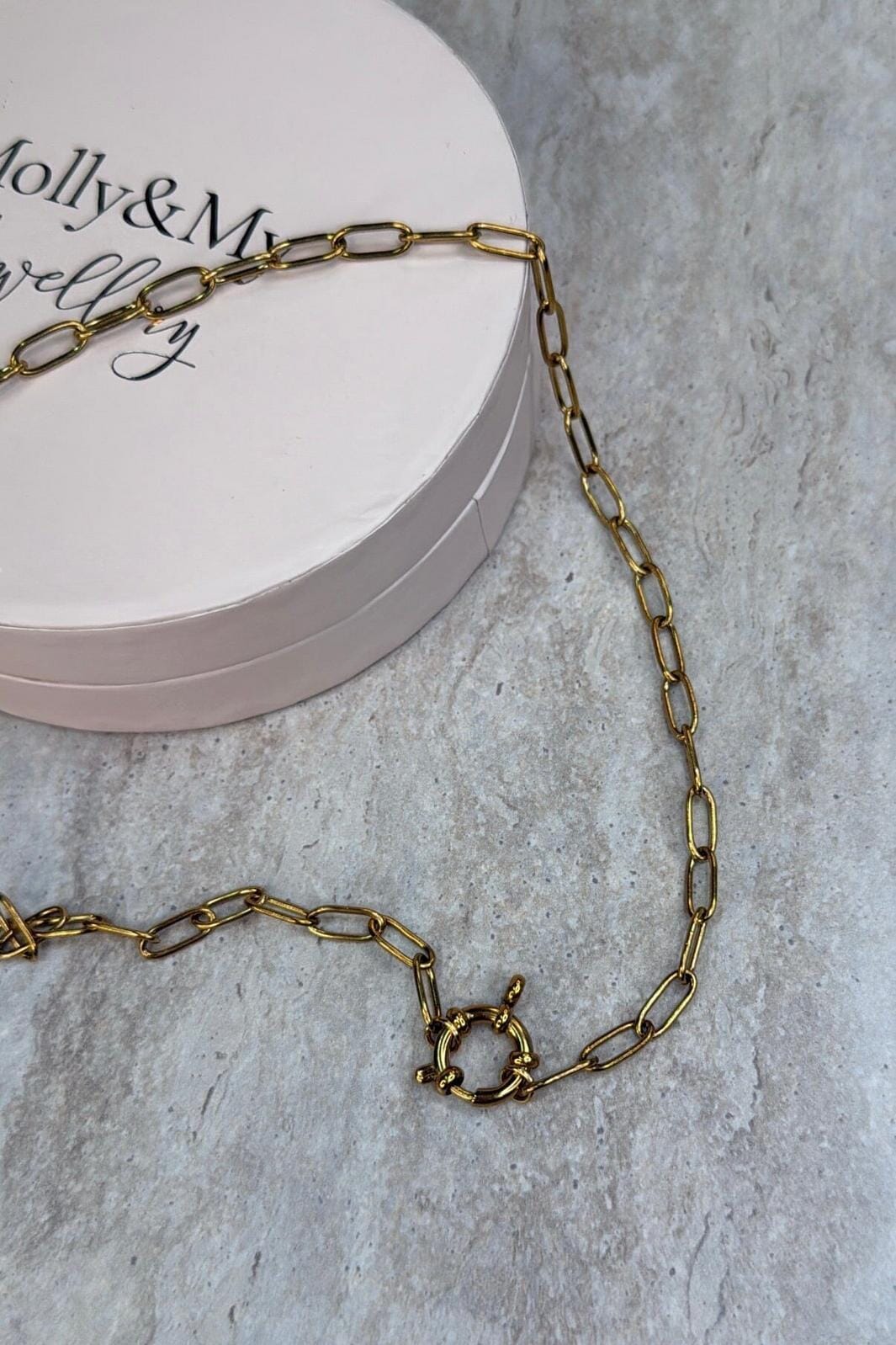Collier de Molly&My Jewellery, fabriqué en acier inoxydable avec une finition dorée. La chaîne présente des maillons allongés et un fermoir rond.