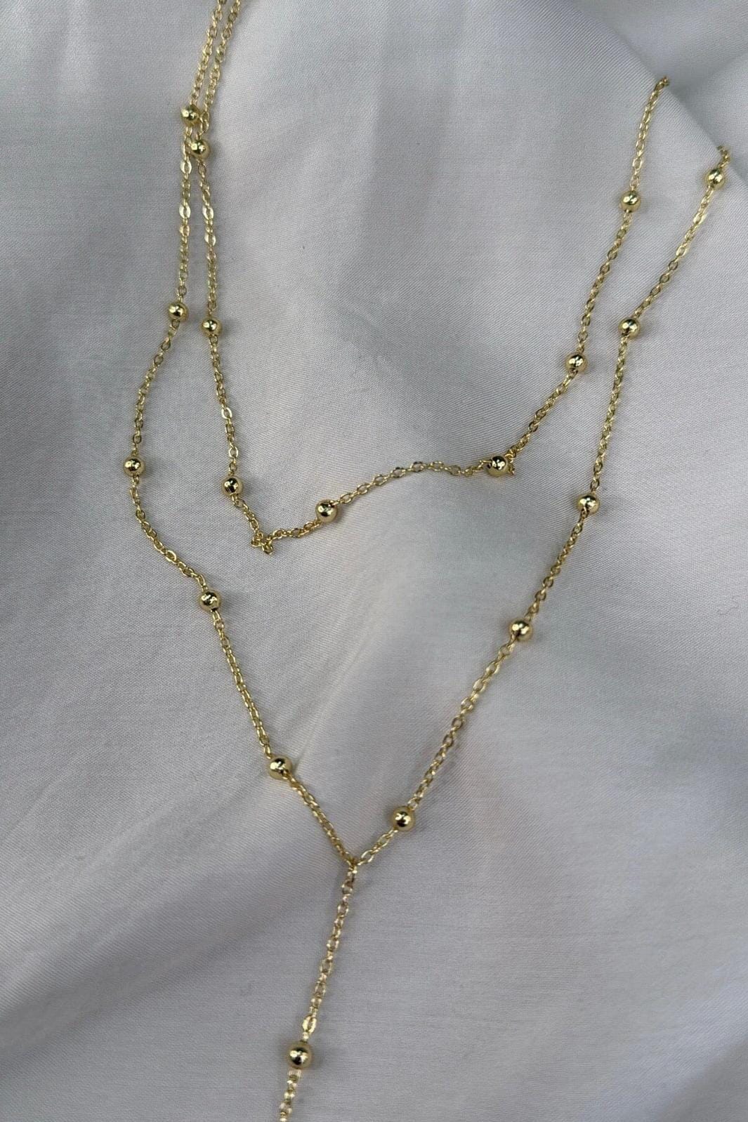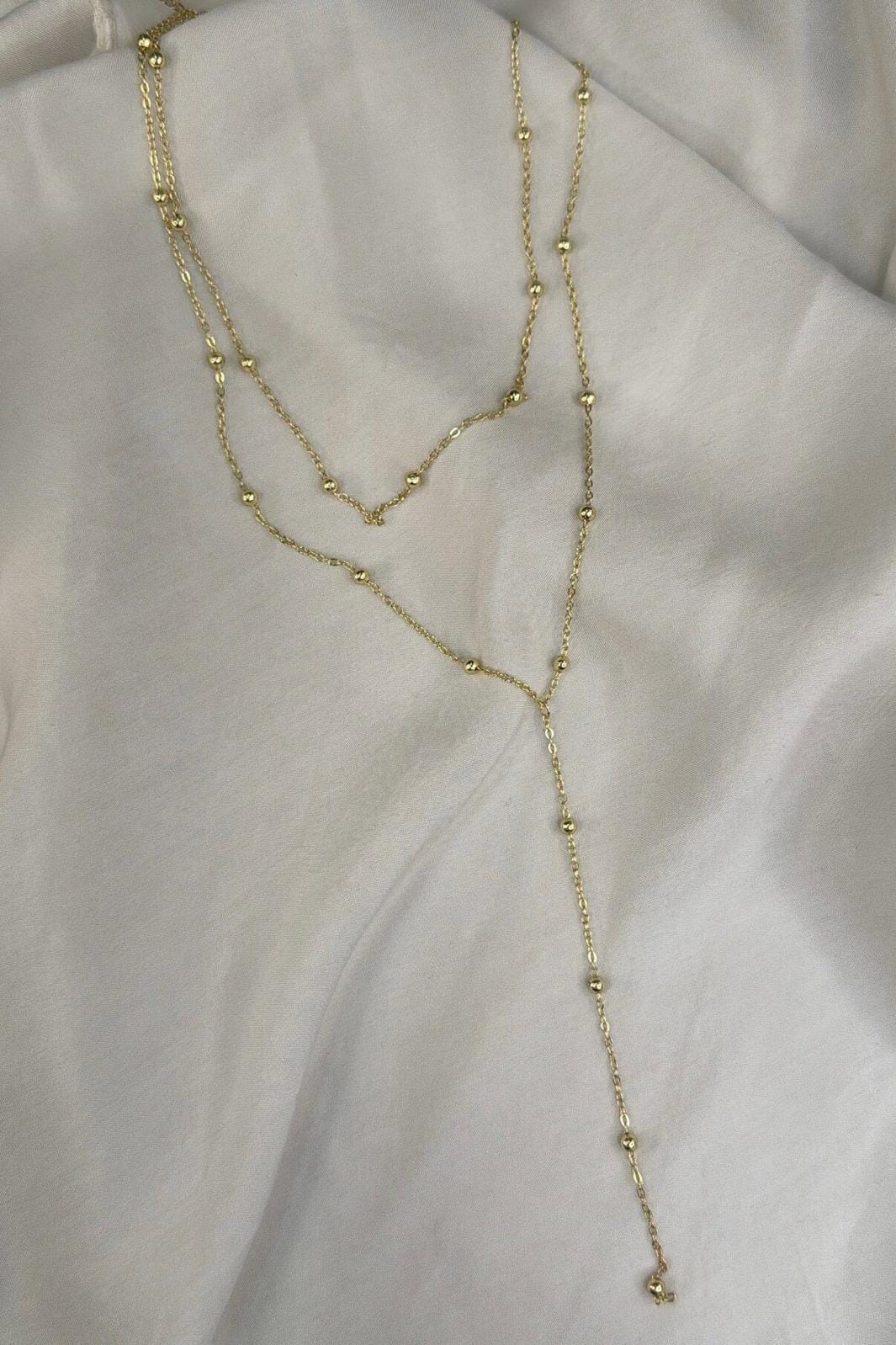 Collier doré Molly&My Jewellery avec de petites perles réparties le long de la chaîne. Le design présente plusieurs couches et une structure en forme de Y.
