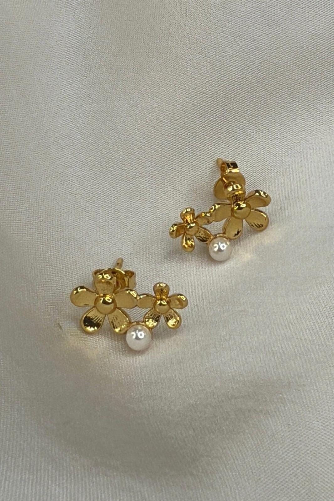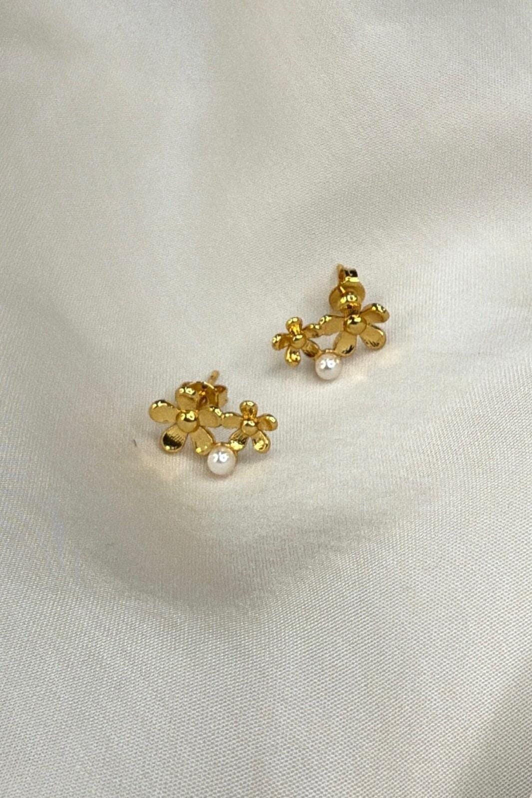 Puces d’oreilles dorées à l’or fin de Molly&My Jewellery avec deux petites fleurs dorées et une perle blanche sur chaque puce.