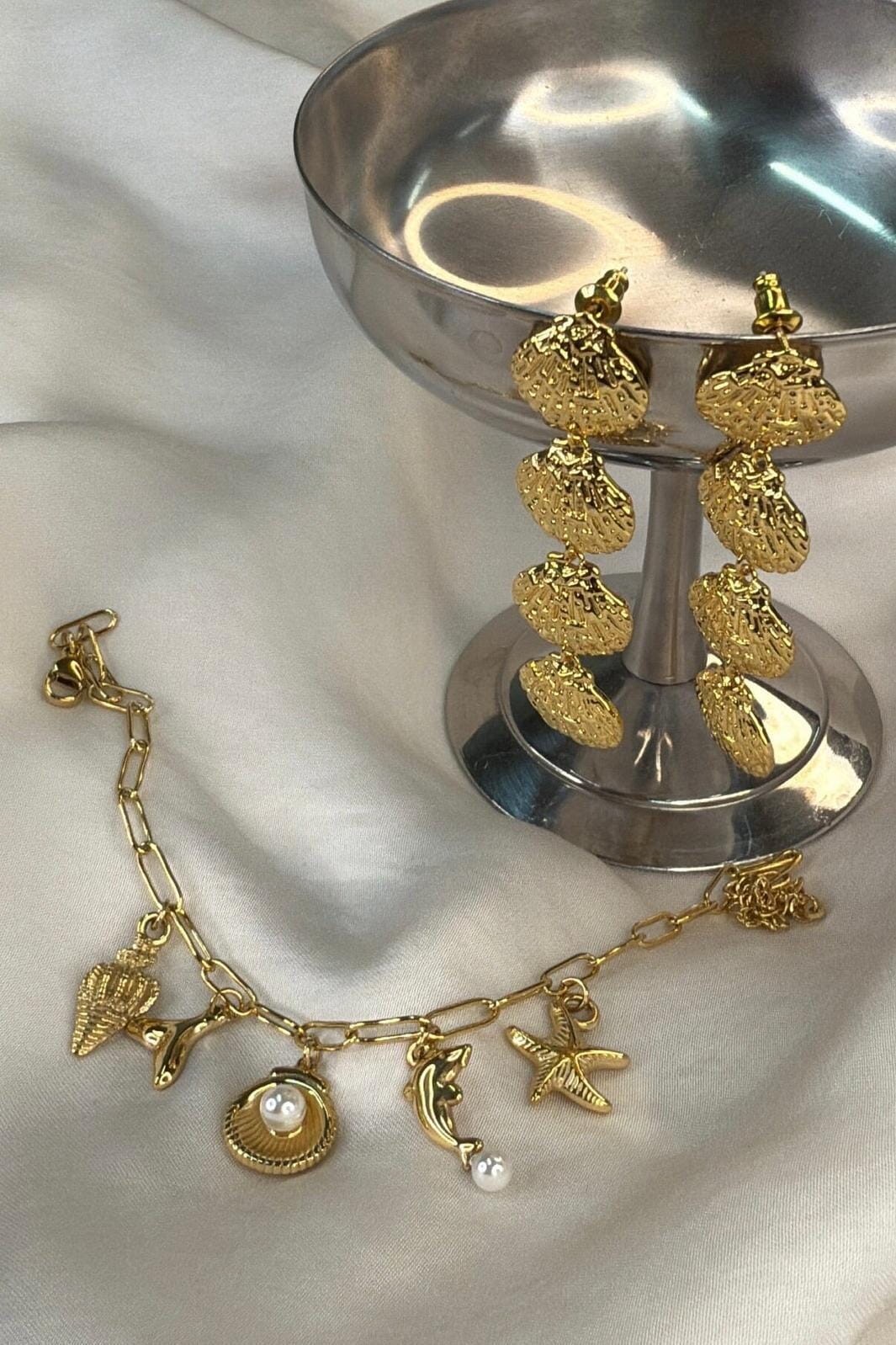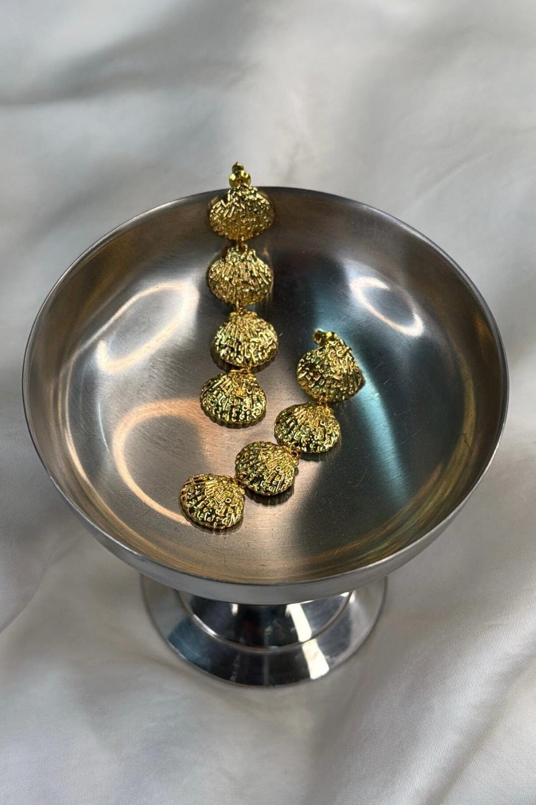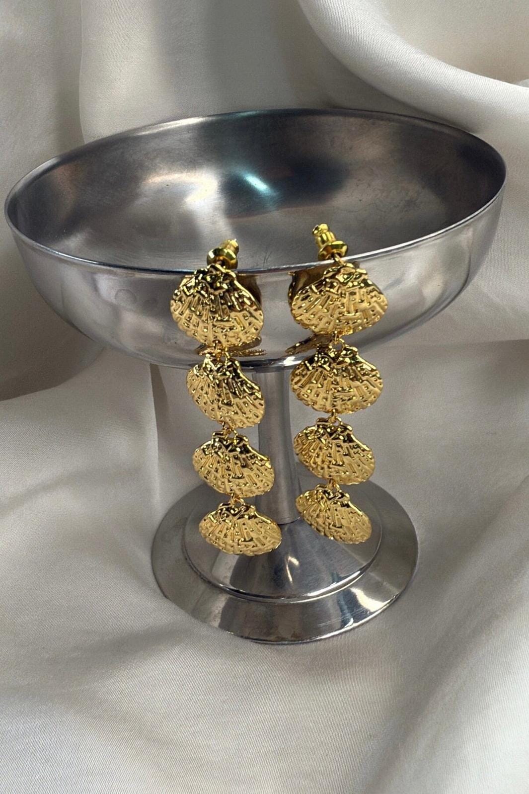 Créoles dorées de Molly&My Jewellery avec des pendentifs en forme de coquillage dans un design en plusieurs parties. La couleur dorée met en valeur la forme du coquillage et donne aux boucles d’oreilles une expression féminine.