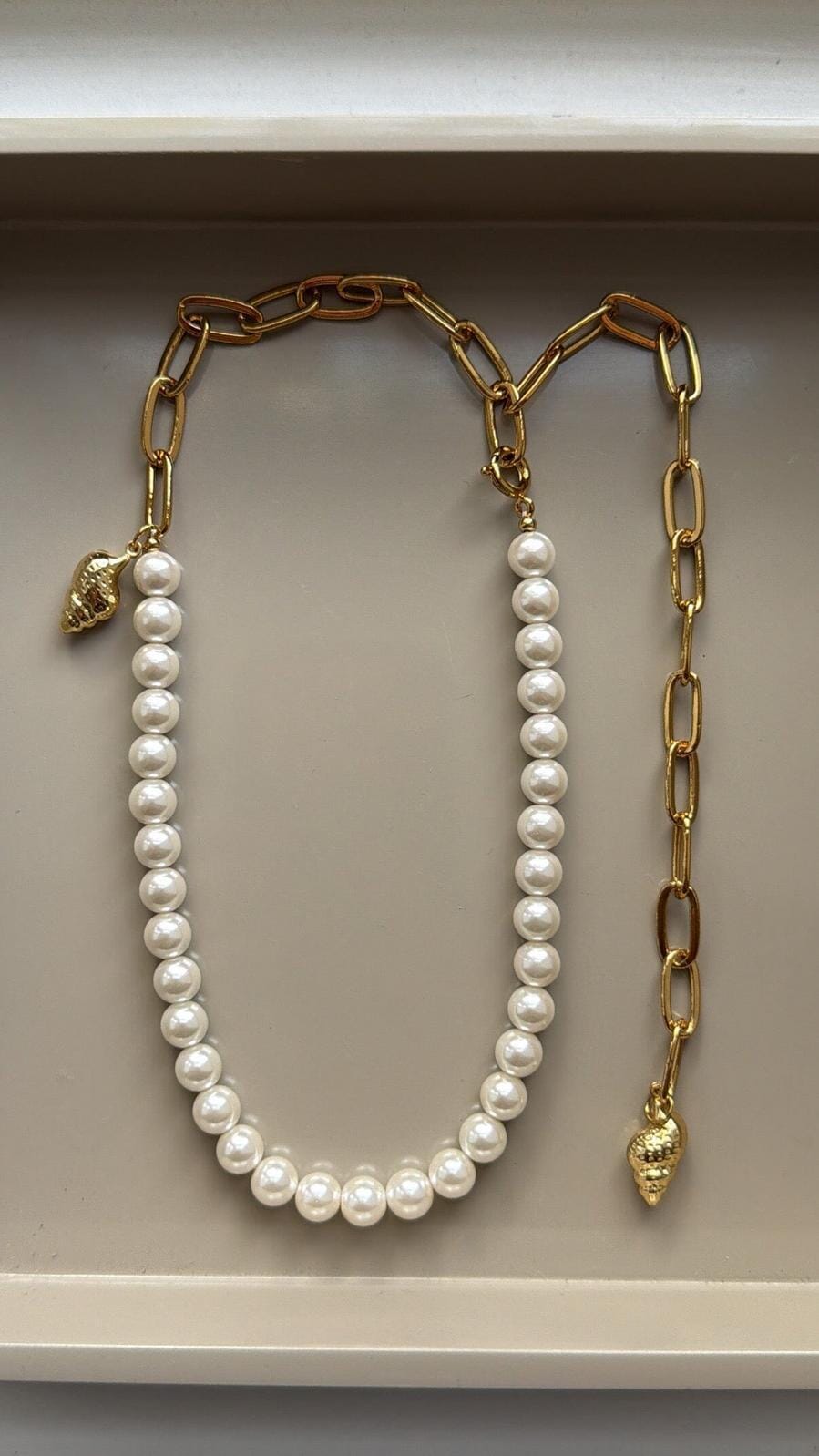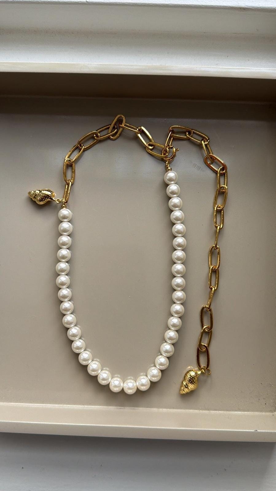 Collier doré à l'or fin de Molly&My Jewellery. Le design combine des perles blanches avec des maillons de chaîne dorés dans une répartition moitié-moitié.