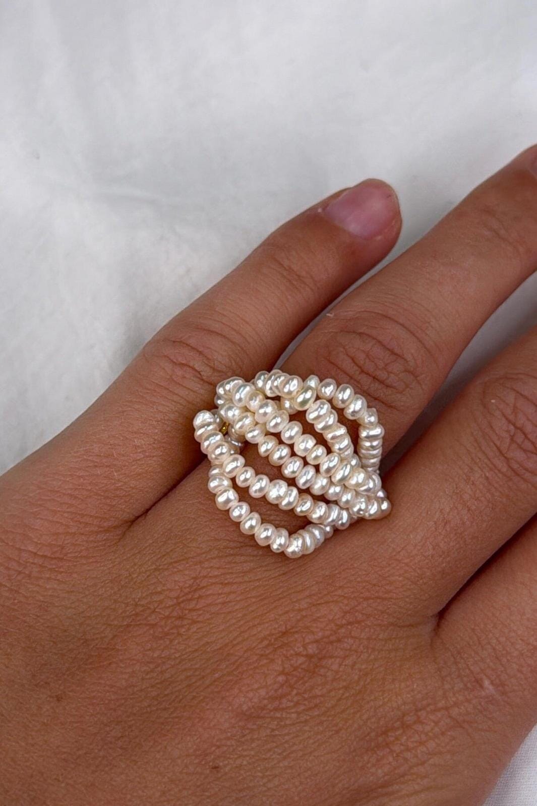 Bague dorée Molly&My Jewellery avec un design en spirale composé de petits éléments semblables à des perles, couvrant une grande partie du doigt.