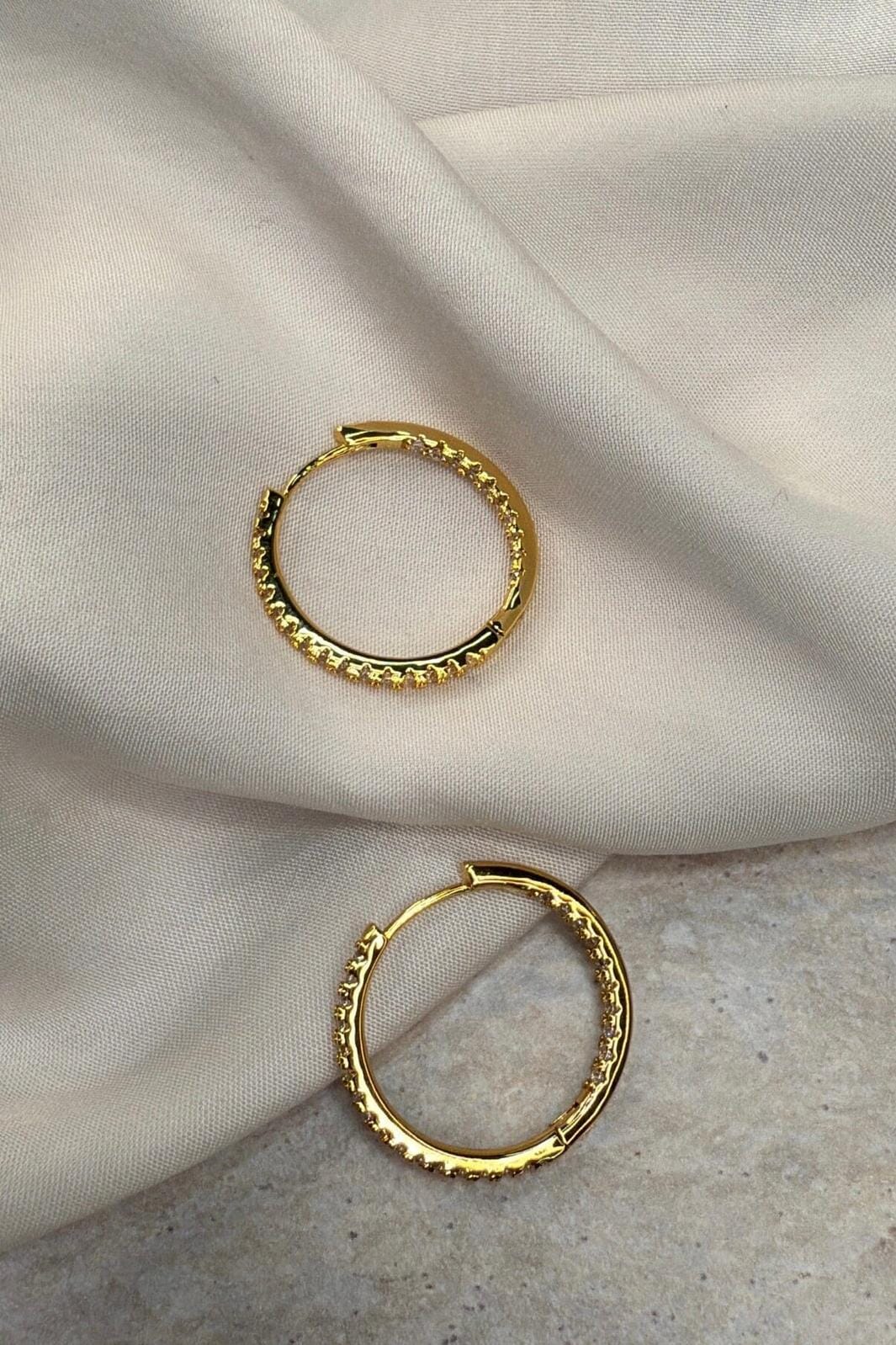 Créoles dorées de Molly&My Jewellery avec de petites pierres claires le long de l’avant. Les boucles d’oreilles sont en laiton avec une surface dorée brillante.