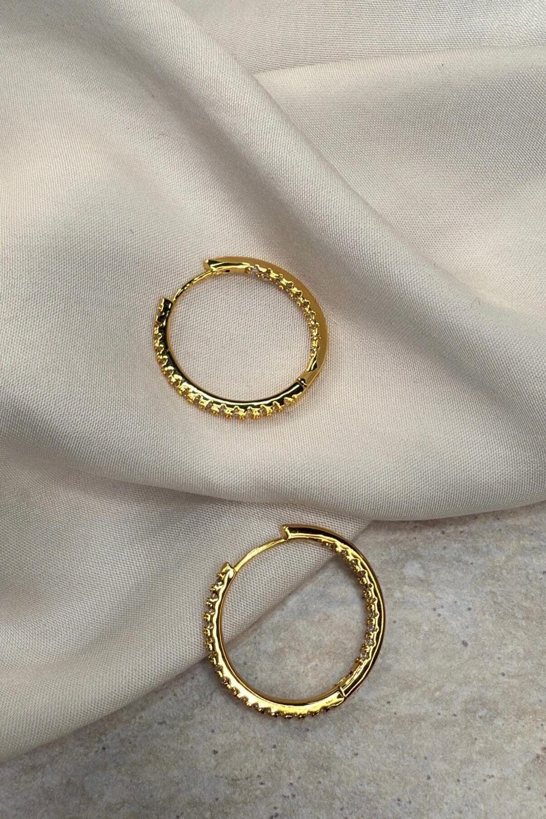 Créoles dorées à l’or fin de Molly&My Jewellery. Les boucles d’oreilles sont en laiton avec de petites pierres CZ transparentes le long du bord extérieur, dans une forme ronde.