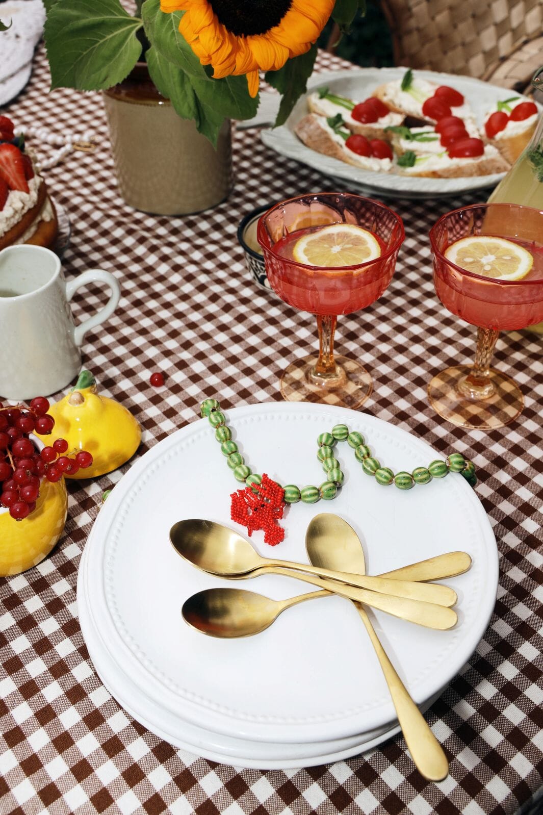 Un collier Molly&My Jewellery x Caroline Dan avec des perles en porcelaine vertes et un pendentif homard rouge en verre.