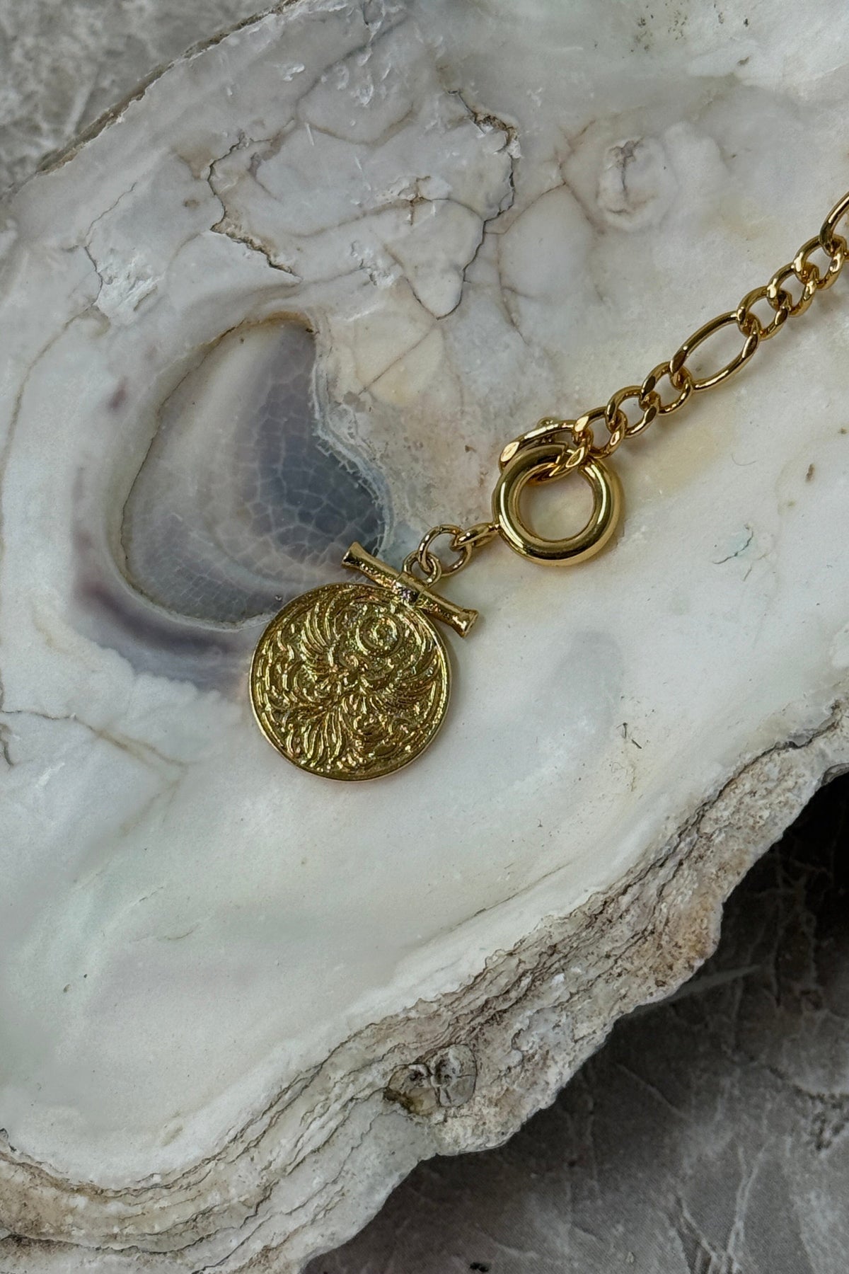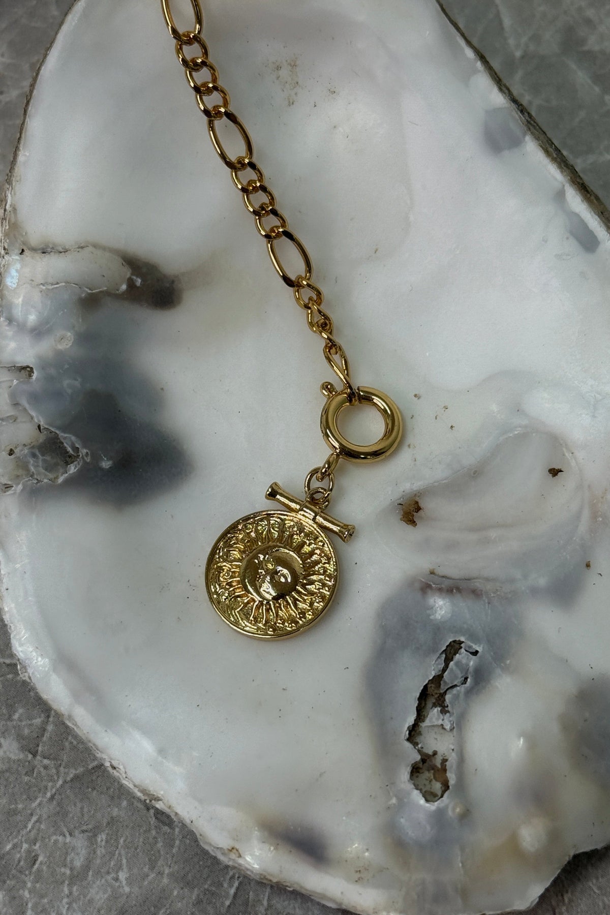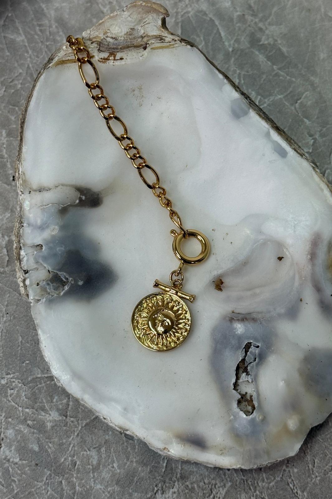Médaillon doré en acier inoxydable de Molly&My Jewellery x Melanie Due avec motif de soleil ou de visage gravé sur une chaîne à maillons ovales.