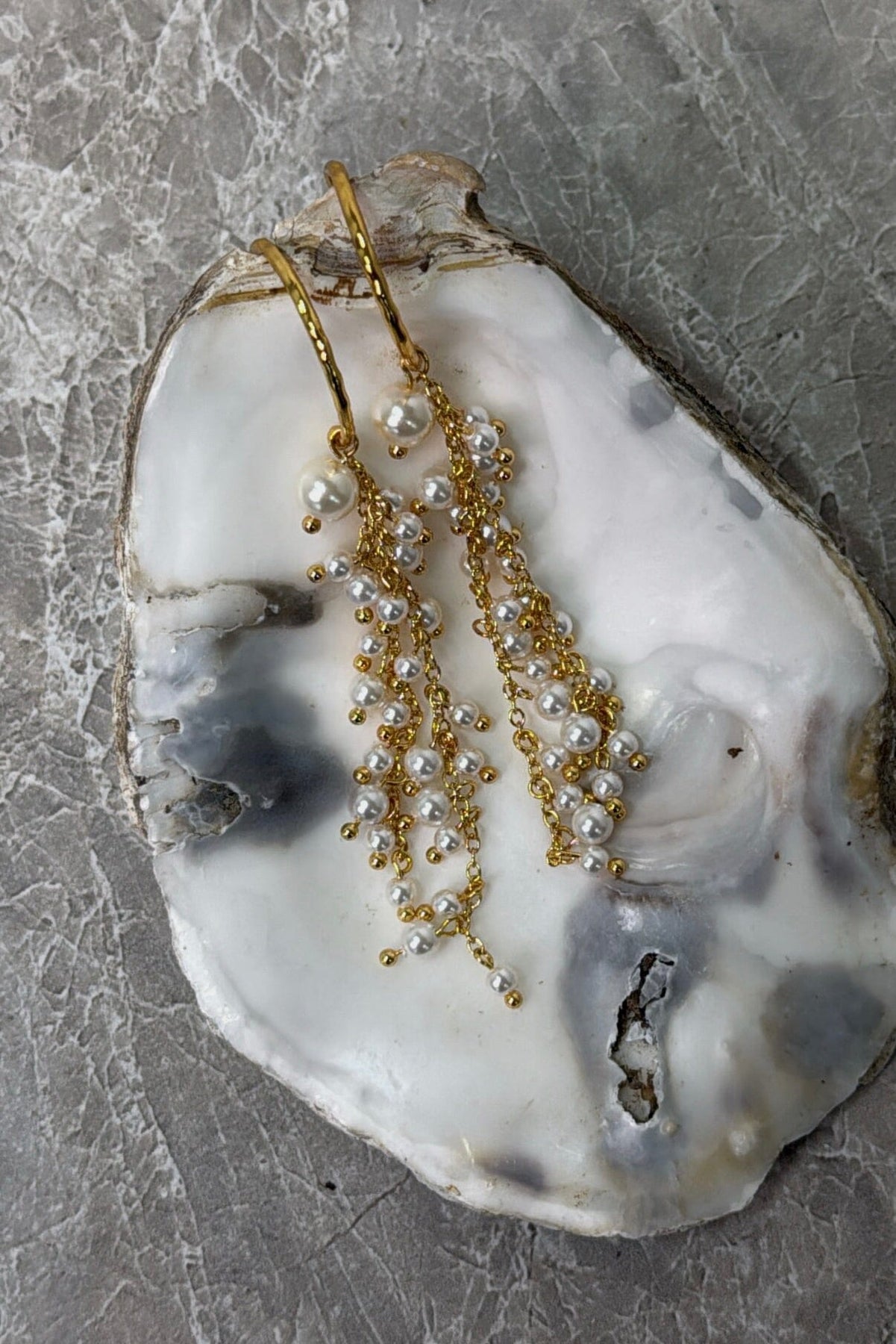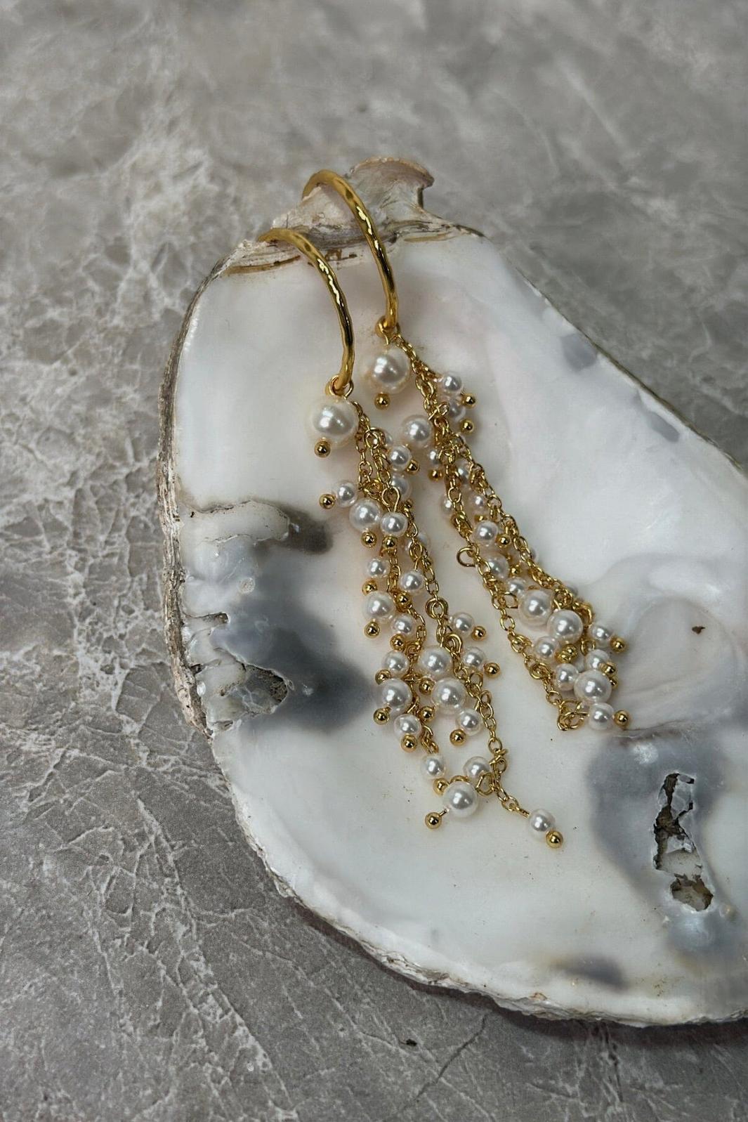 Créoles dorées Molly&My Jewellery x Melanie Due, en acier inoxydable avec pendentifs en chaînes et perles.