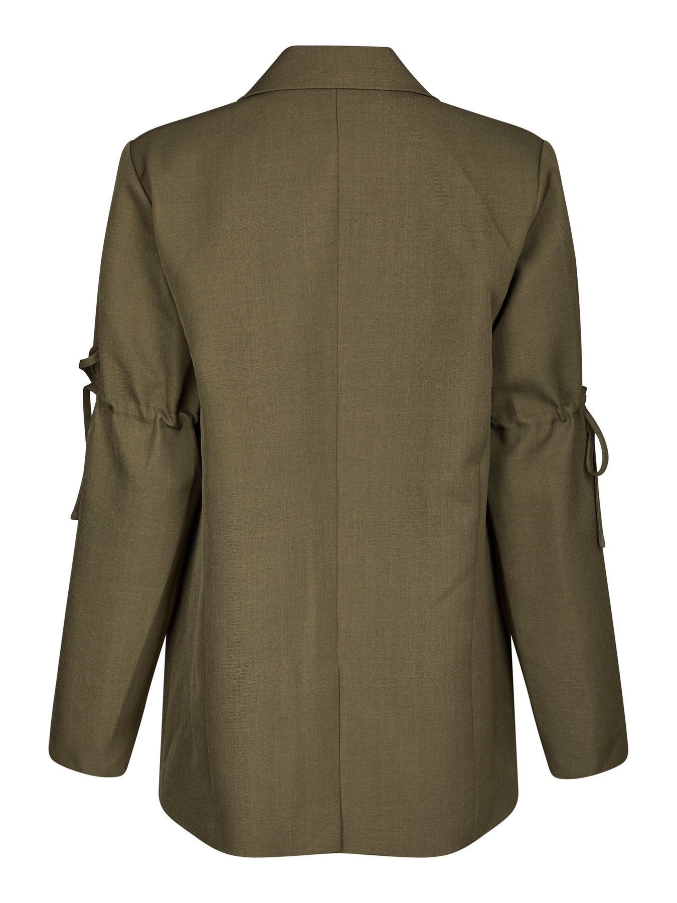 Blazer de Molly&My x Julie Elgaard en vert kaki. Le blazer présente des détails à lacets sur les manches, des boutons décoratifs sur le devant et deux poches avant à rabat.