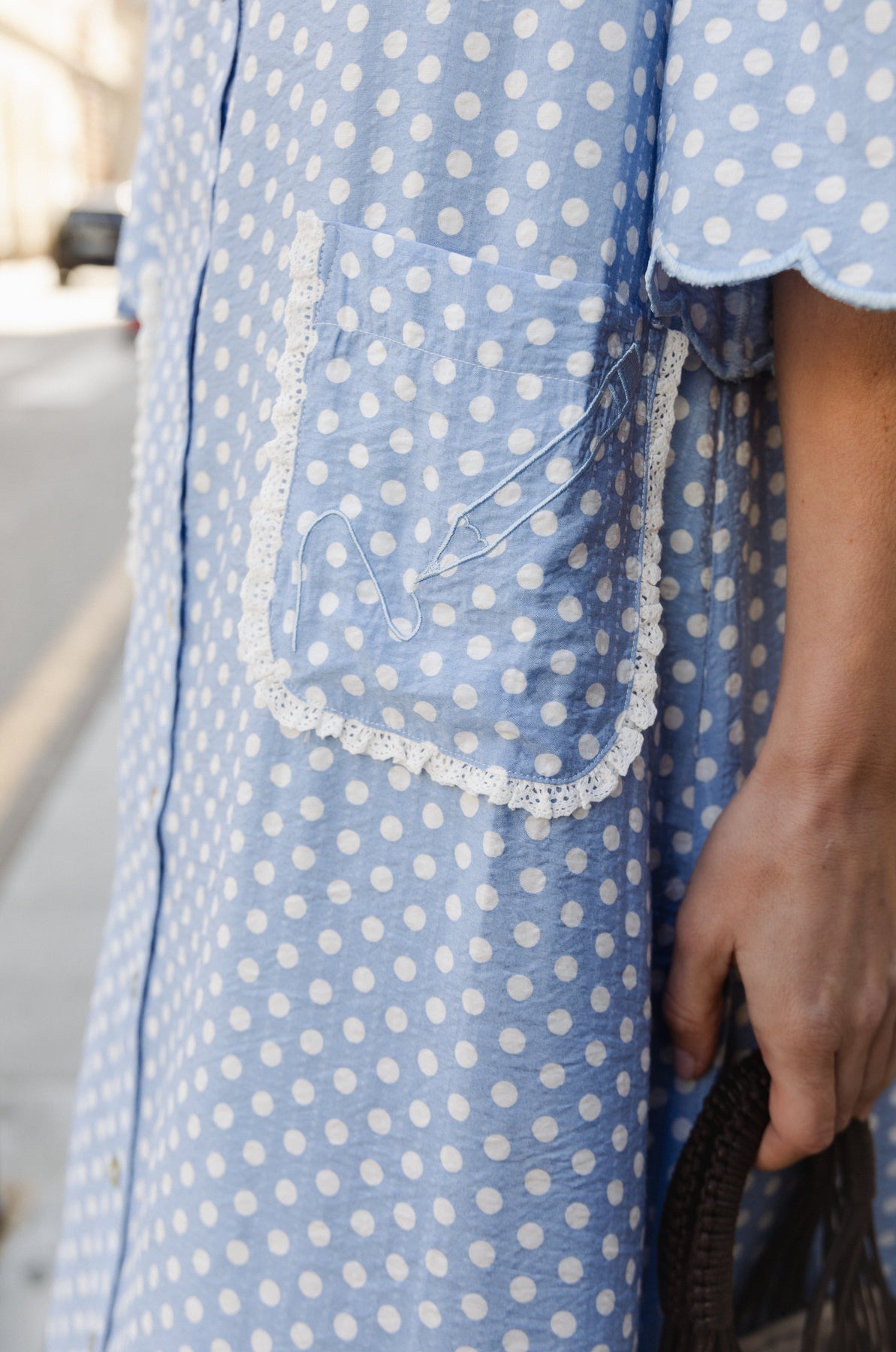 Robe Molly&My x Julie Elsebeth à pois blancs sur fond bleu. La robe présente des coutures décoratives et de la dentelle le long du bord de la poche.