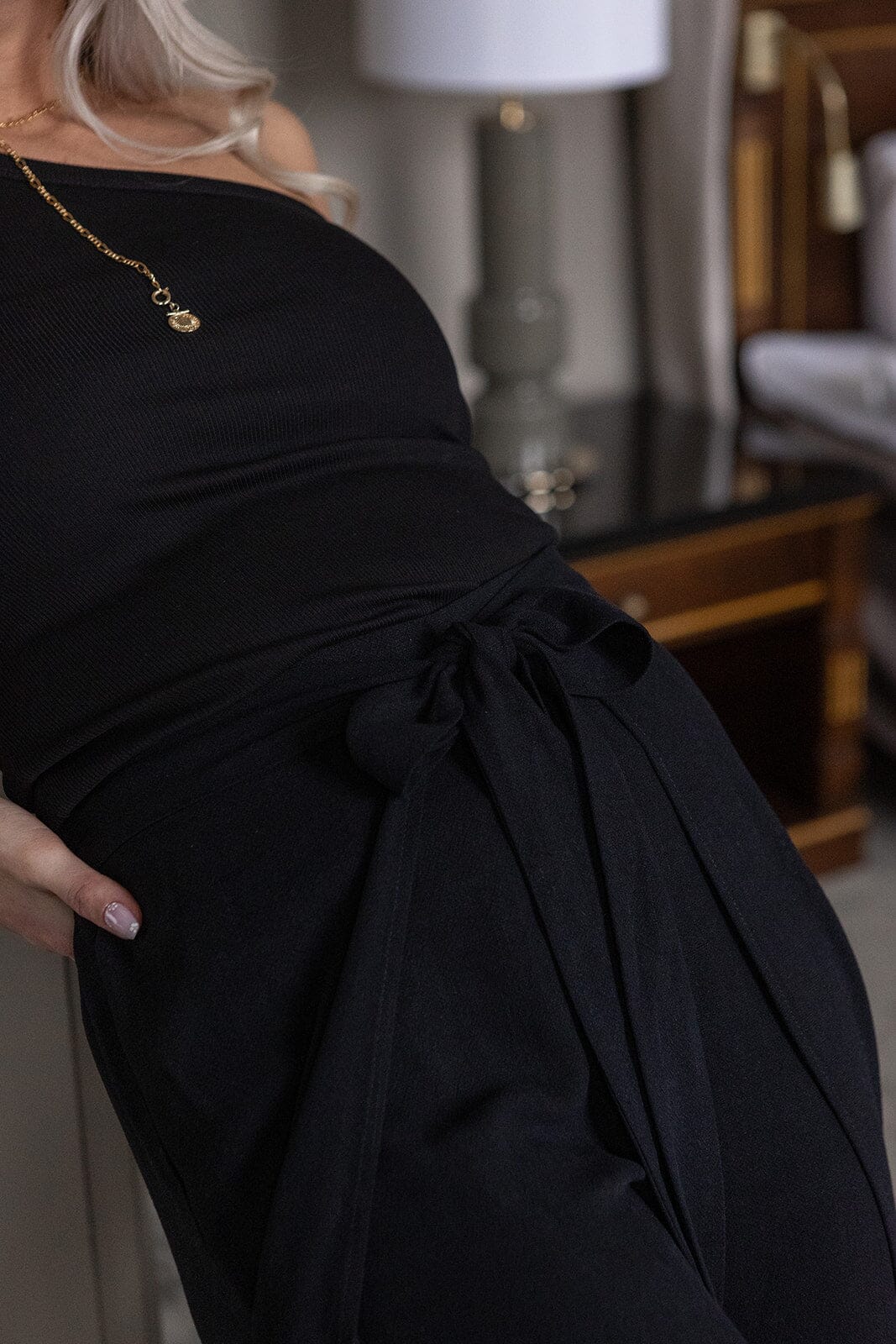 Top noir côtelé de Molly & My X Melanie Due avec design off-shoulder et bretelle asymétrique. Elle convient aussi bien au quotidien qu’aux occasions festives.