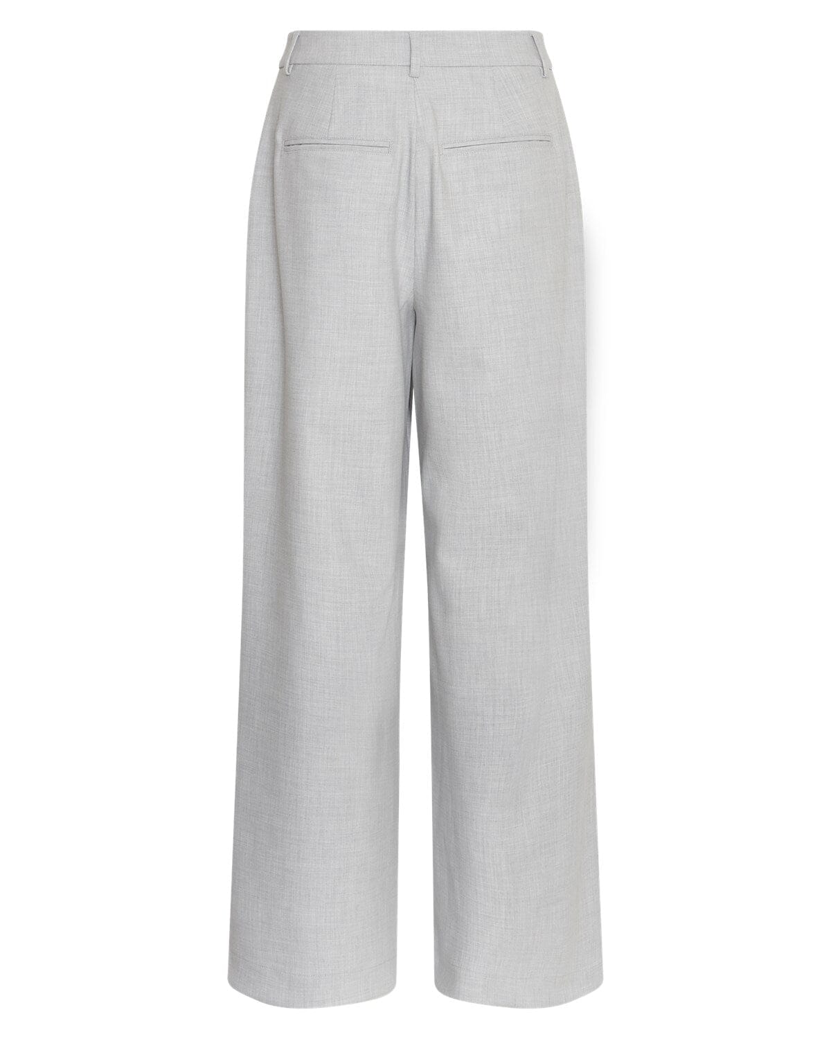 Pantalons gris clair à jambe large de MSCH Copenhagen. Les pantalons ont une coupe regular et arrivent au milieu du mollet.