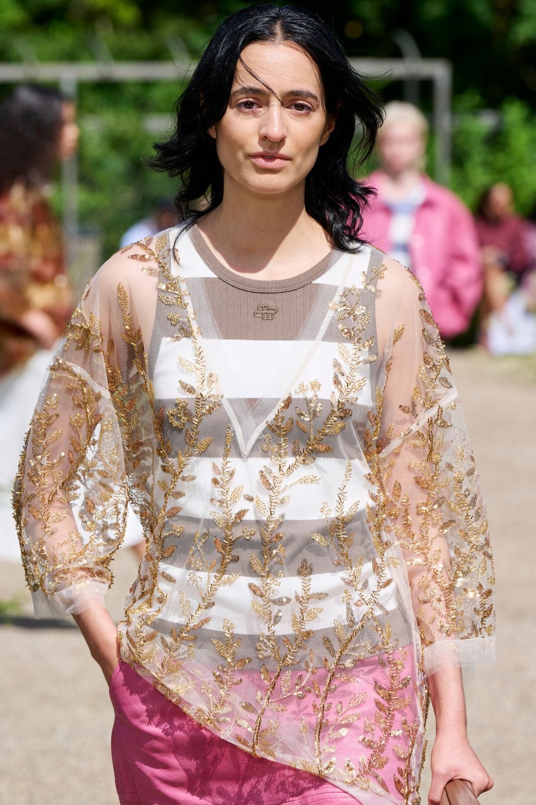Haut doré de Munthe, confectionné en polyester transparent avec broderies dorées, sequins et détails de perles formant un motif de feuilles sur l’ensemble du haut.