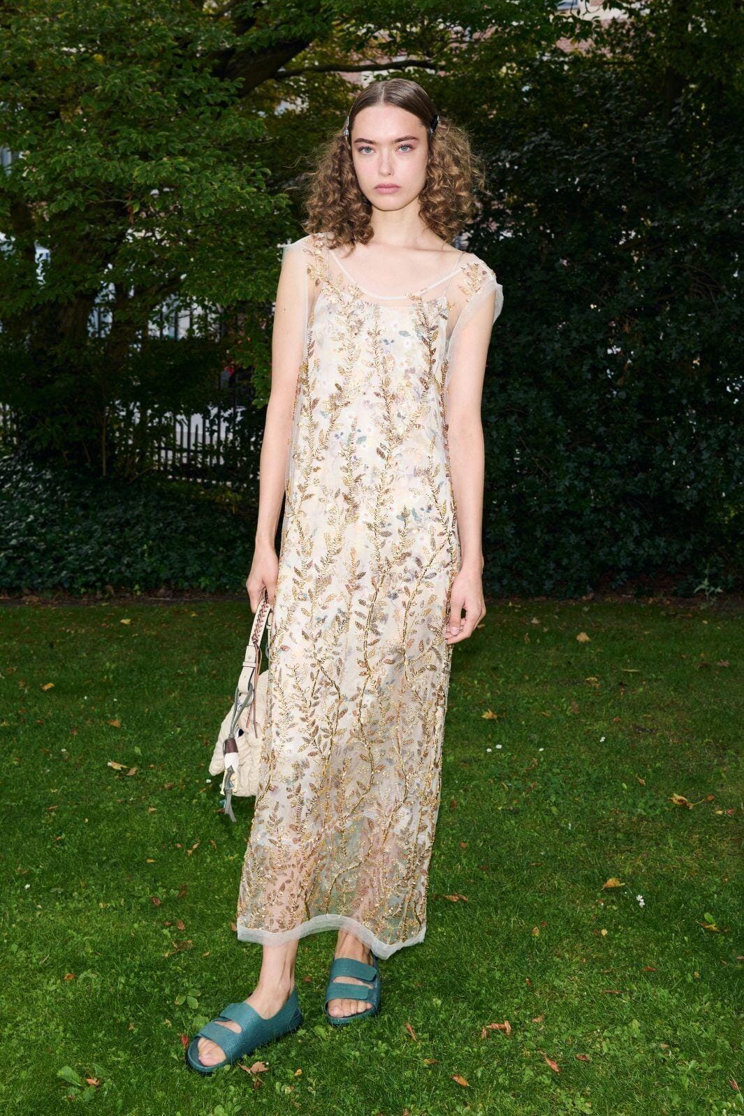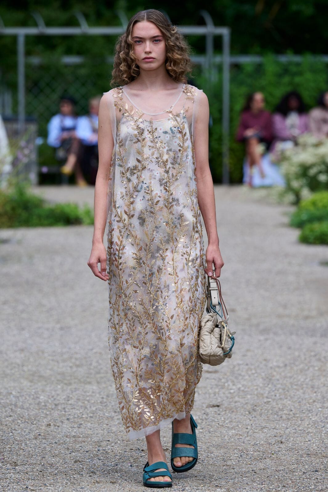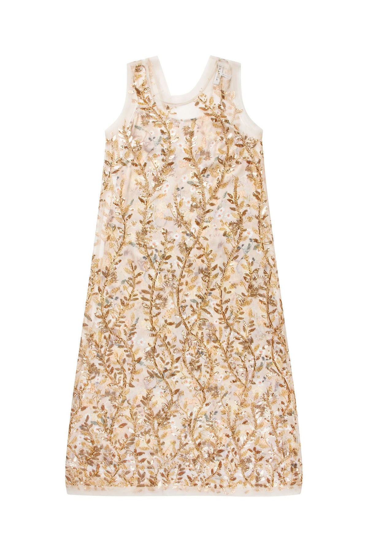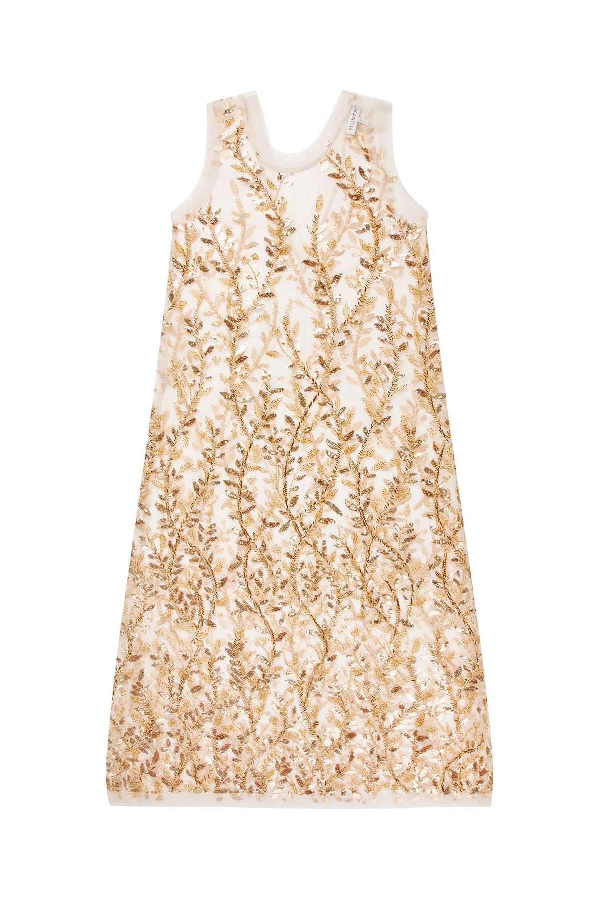 Robe Munthe dorée avec un motif floral créé par des broderies, des paillettes et des détails perlés, disposés en motif en forme de feuille sur un tissu semi-transparent.