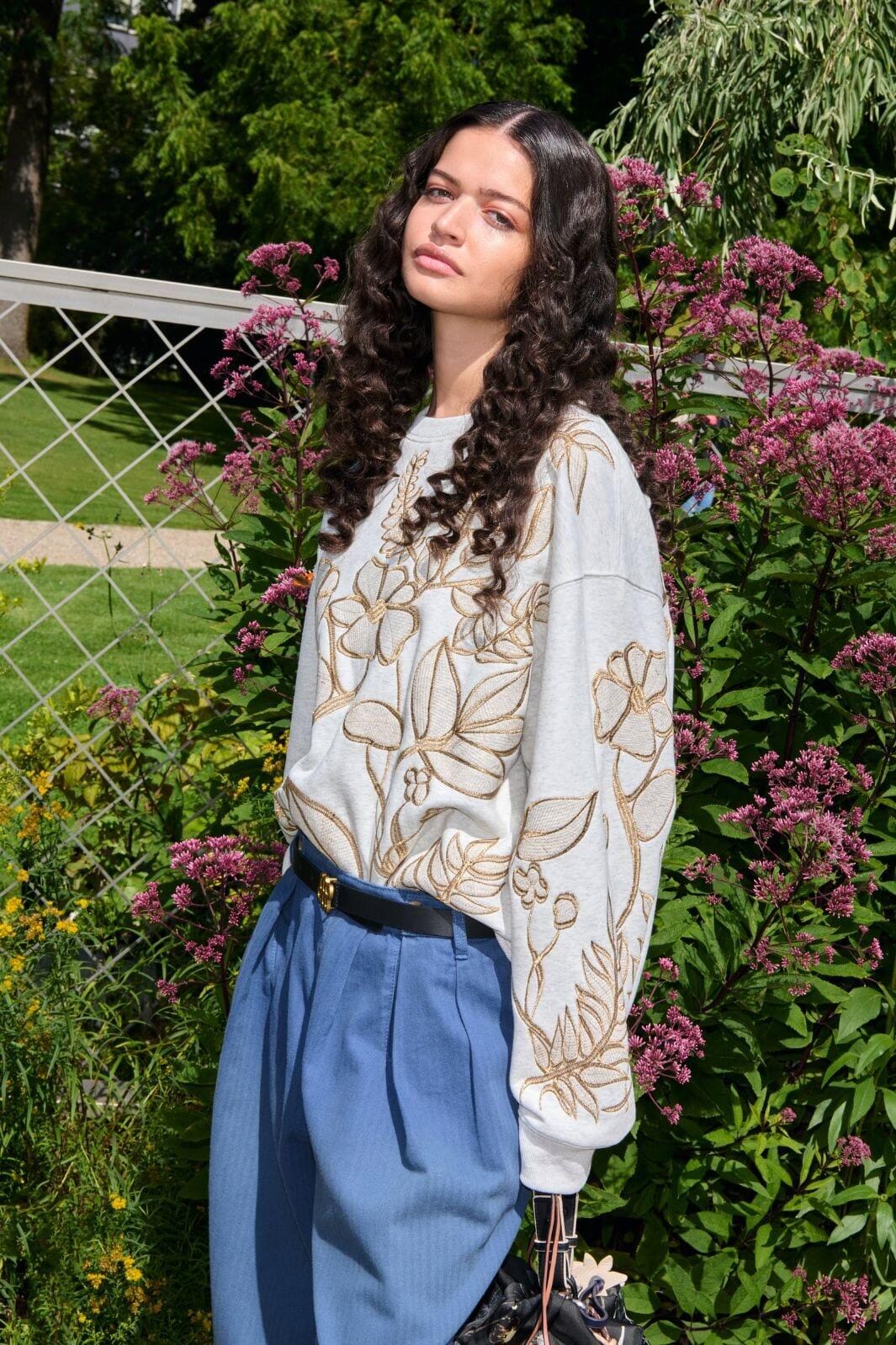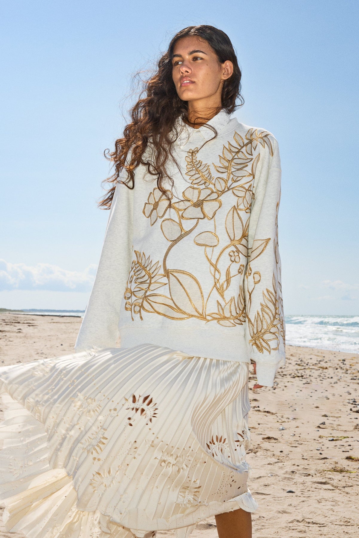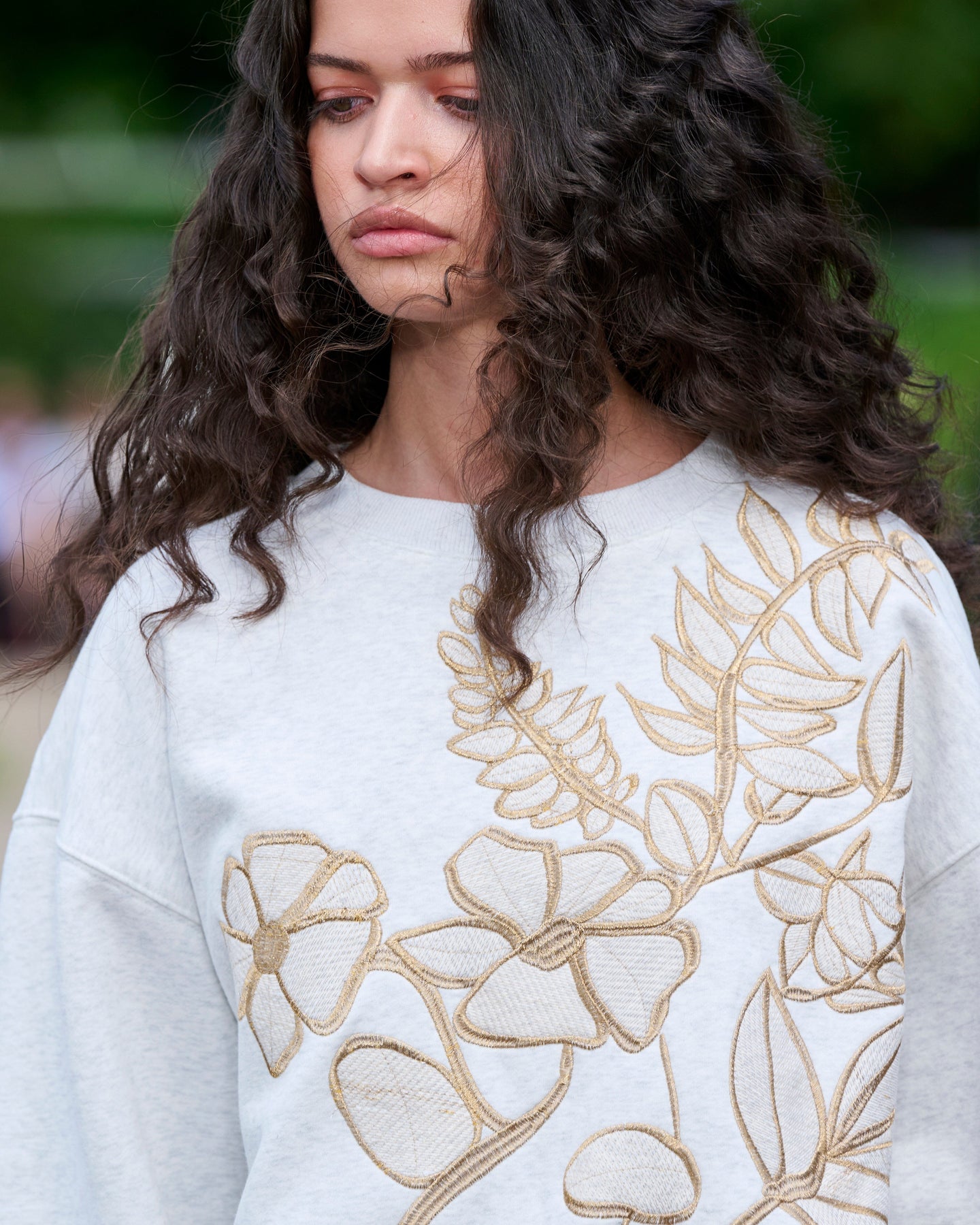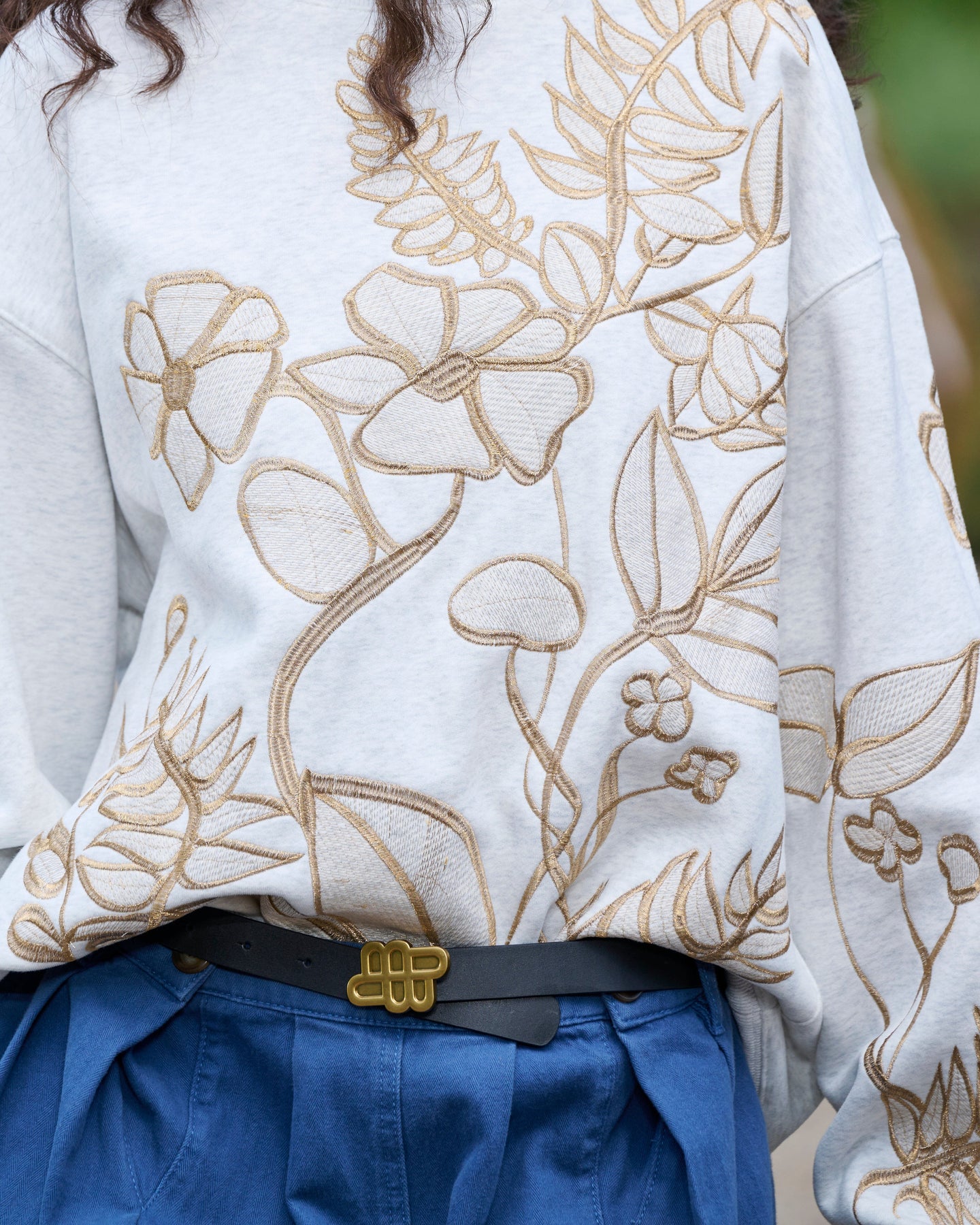 Sweat-shirt gris clair de Munthe avec broderie florale dans des tons dorés sur le devant et les manches. Coupe oversize avec encolure ronde et manches longues.