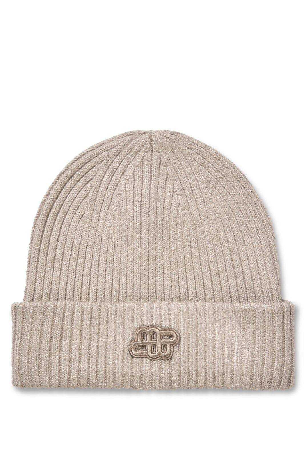 Bonnet beige de Munthe avec design en côtes. Le bonnet a un revers et un logo brodé sur le devant. Il est fabriqué à partir d'un mélange doux de polyester recyclé.