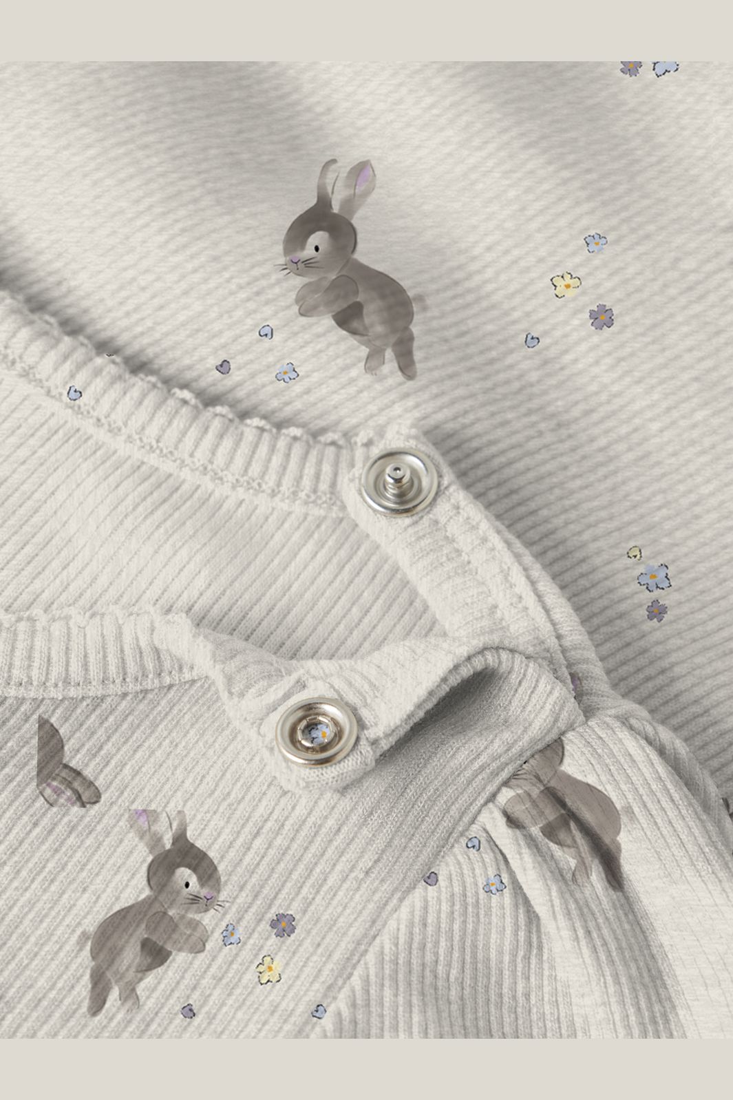 Body à manches longues de Name It avec imprimé de petits lapins et de fleurs sur un fond beige chiné. Le tissu en maille côtelée présente une structure rayée verticale.