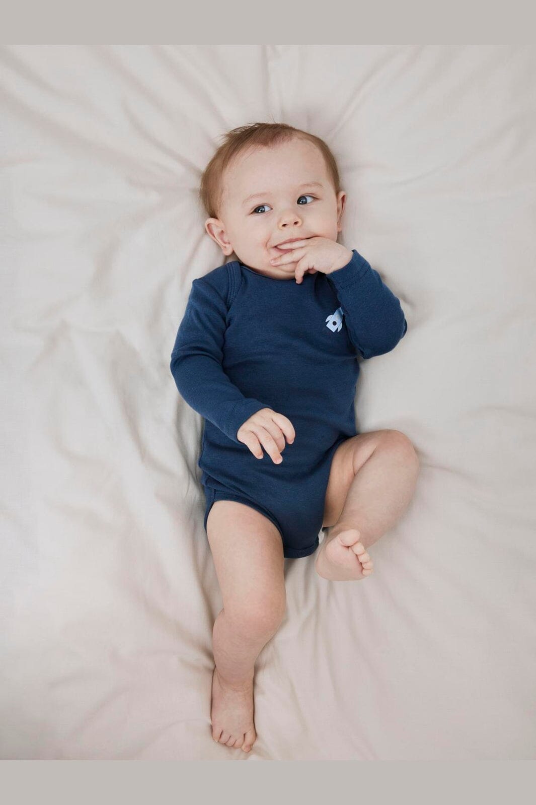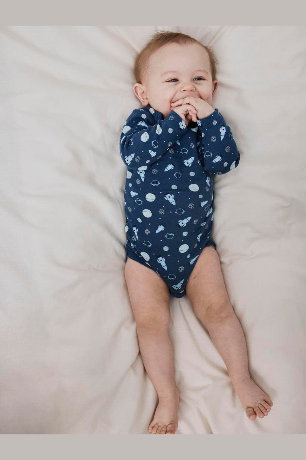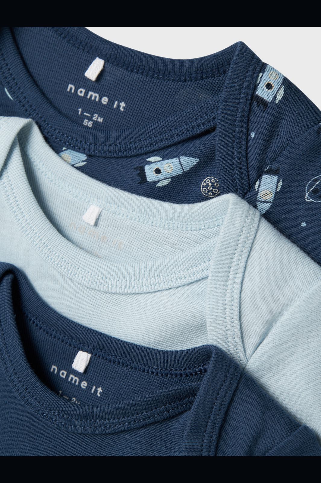 Body à manches longues de Name It en bleu foncé avec un thème spatial. Le body est également disponible en bleu clair uni. Les deux variantes présentent un imprimé avec des fusées et des planètes ou un design uni.