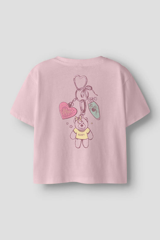 T-shirt rose de Name It en coton biologique. Le t-shirt a un motif d'ours avec le texte ALERT sur le devant et un design graphique plus grand au dos.
