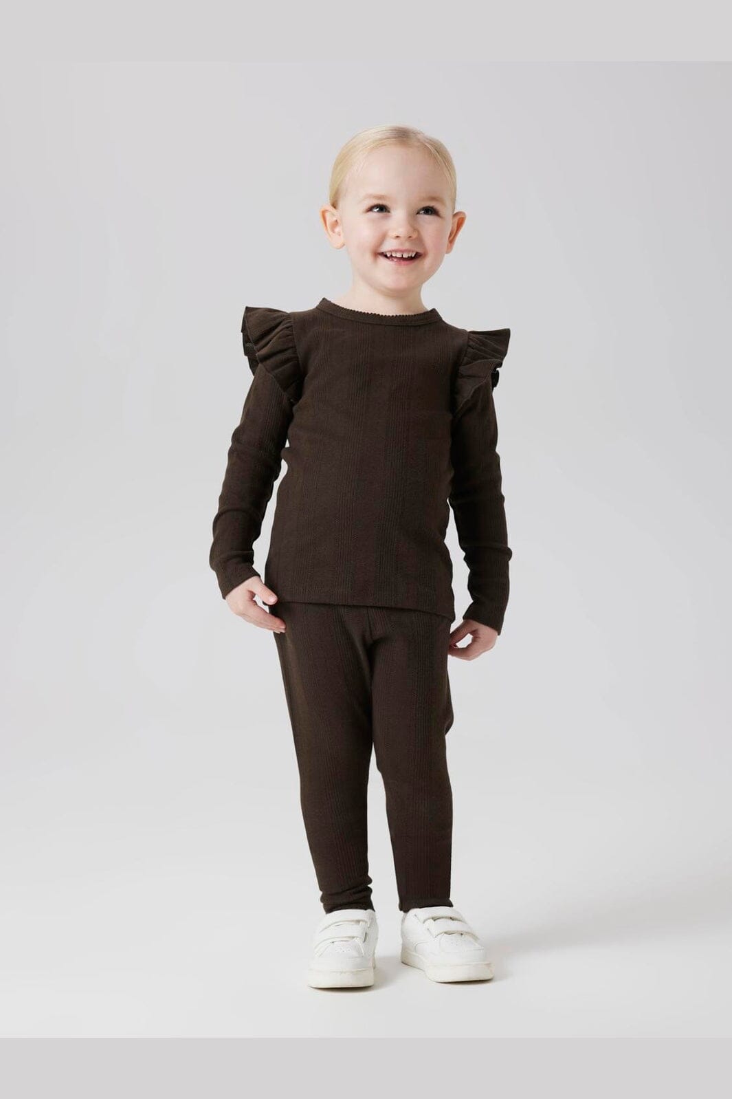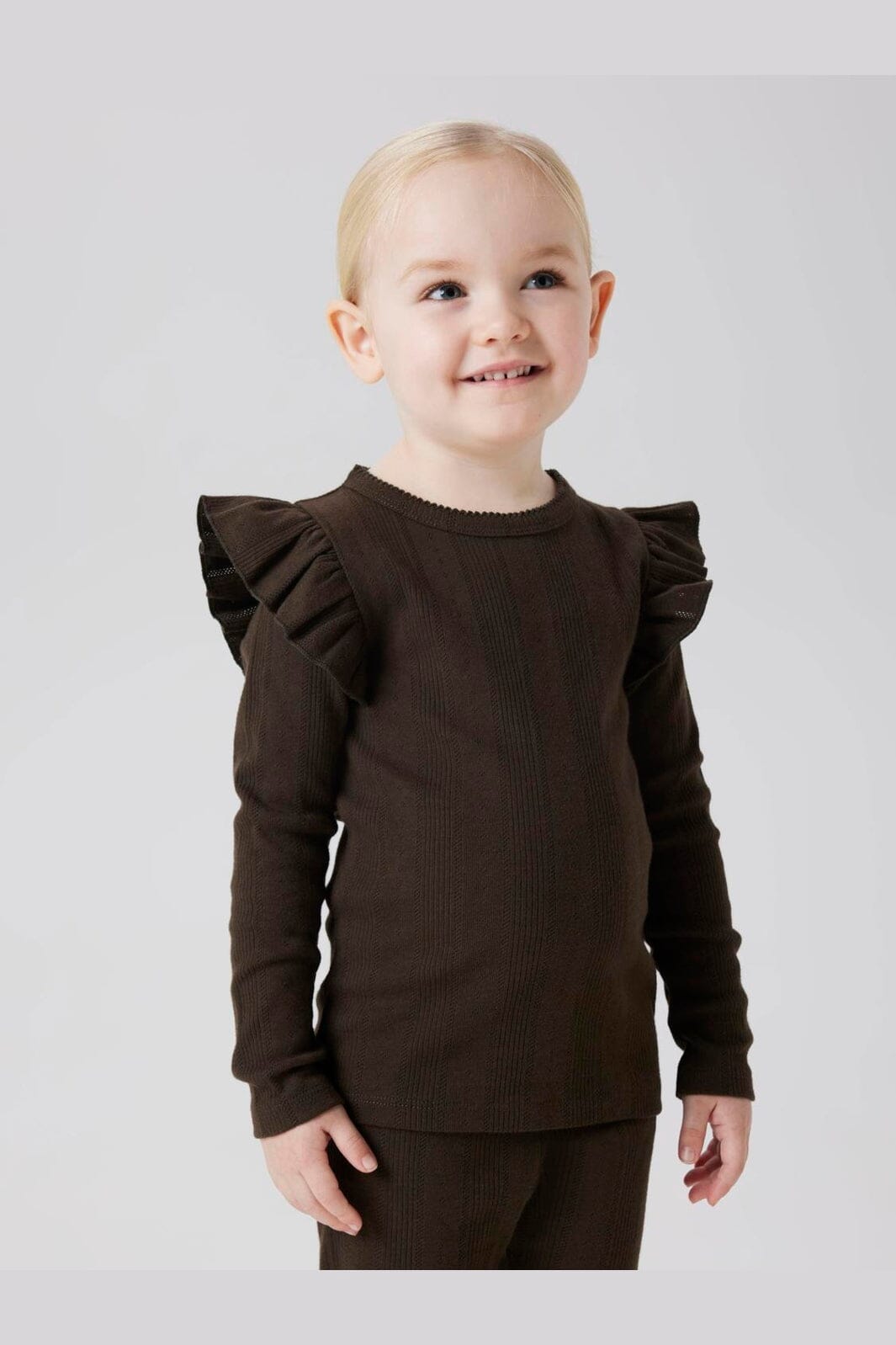 Haut à manches longues de Name It de couleur marron. Le haut présente une structure côtelée avec des motifs verticaux.