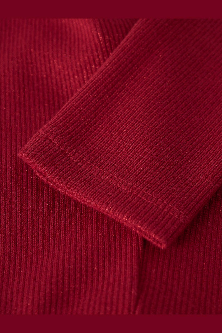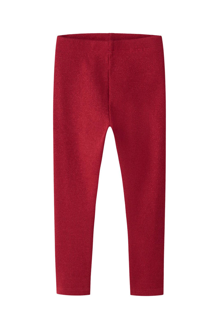 Leggings rouges de Name It avec texture côtelée. Fabriqués en un mélange de coton doux avec des fibres métalliques, offrant un léger éclat. La taille élastique assure une bonne liberté de mouvement.