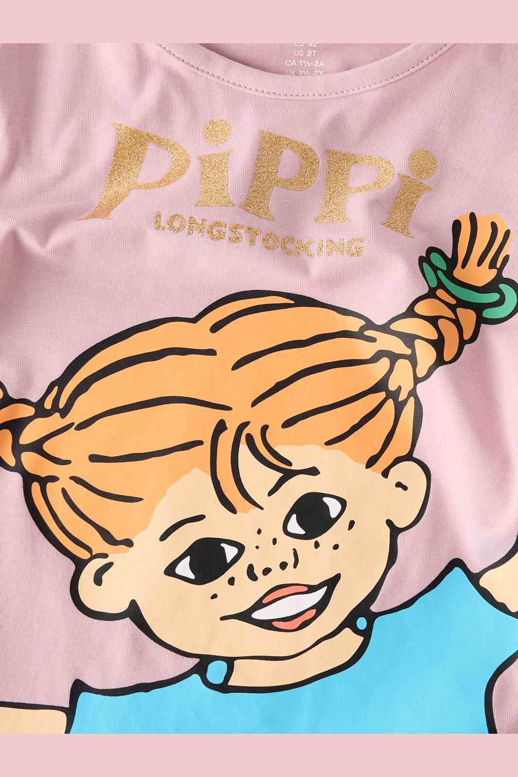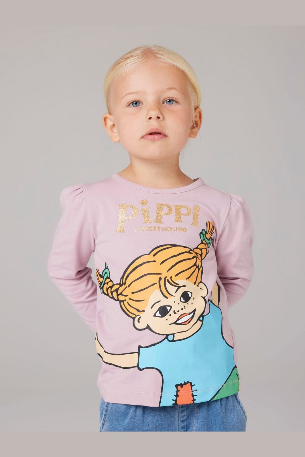 Top à manches longues de Name It en violet clair avec un grand motif de Pippi Longstocking sur le devant. Le texte doré et l'imprimé coloré donnent à ce top une expression ludique.