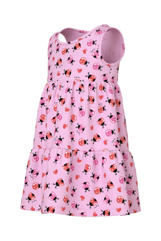 Robe sans manches rose de Name It avec coccinelles et cœurs. La robe a un col rond et est sans manches avec un volant en bas. Le tissu est léger et extensible.