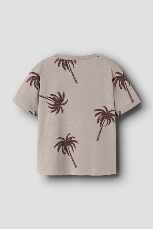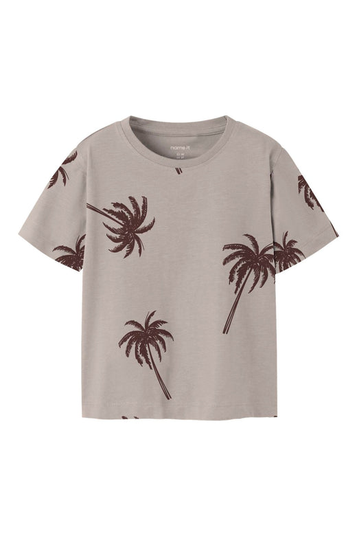T-shirt gris de Name It avec des palmiers bruns. Le t-shirt a un col rond et des manches courtes.
