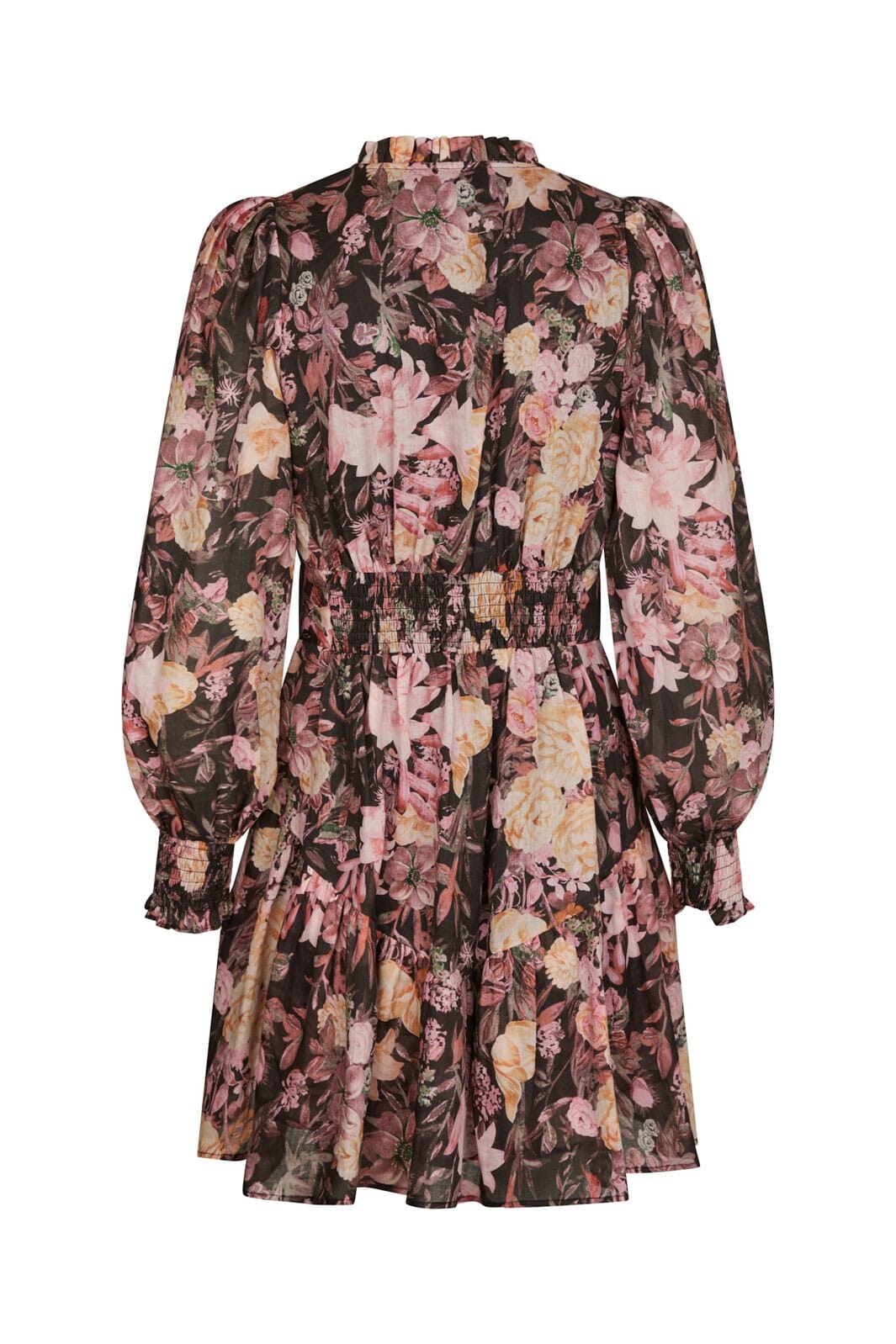 Robe noire de Neo Noir avec de grandes fleurs en rose, jaune et vert. La robe a un col haut, de longues manches bouffantes et des boutons à l'avant. Un volant en bas donne à la robe une touche féminine.