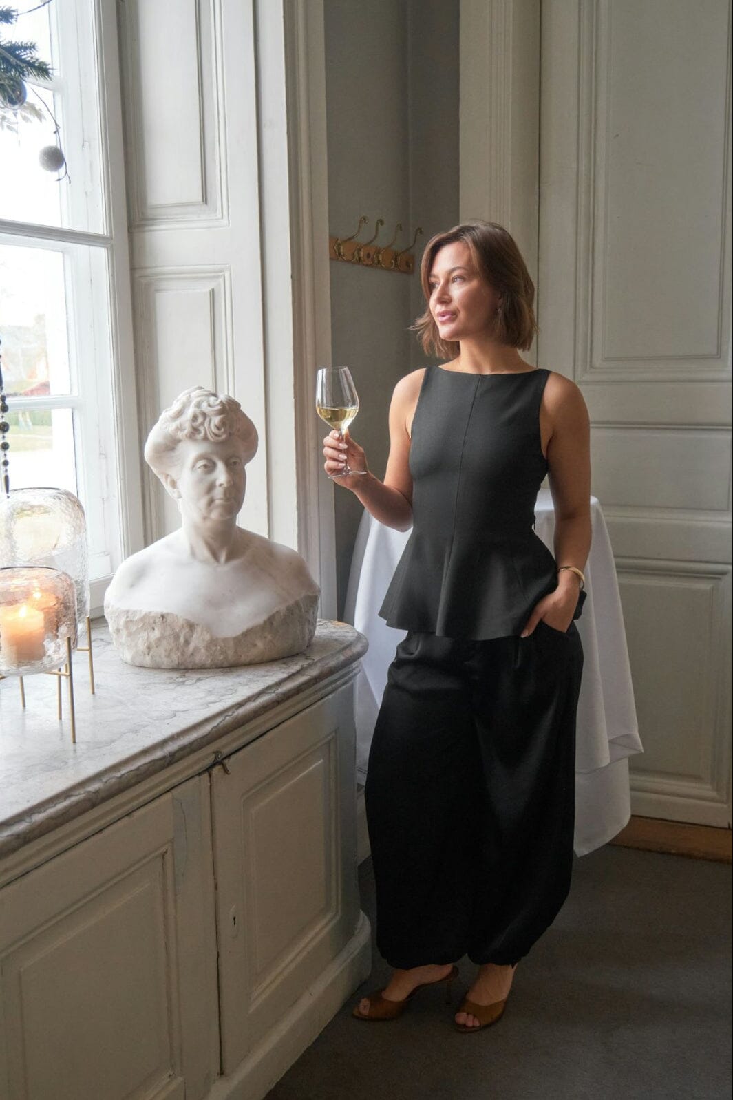 Top noir de Neo Noir avec décolleté carré. Le top a une coupe ajustée avec de l'ampleur en bas et se noue avec un nœud dans le dos.