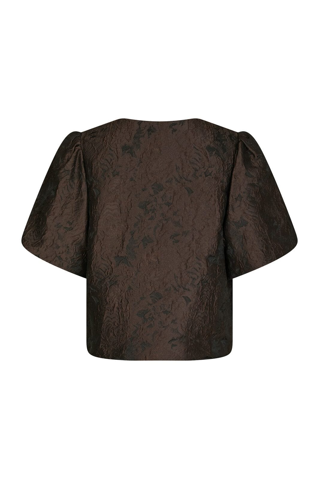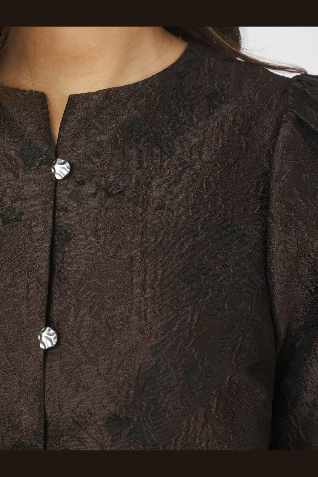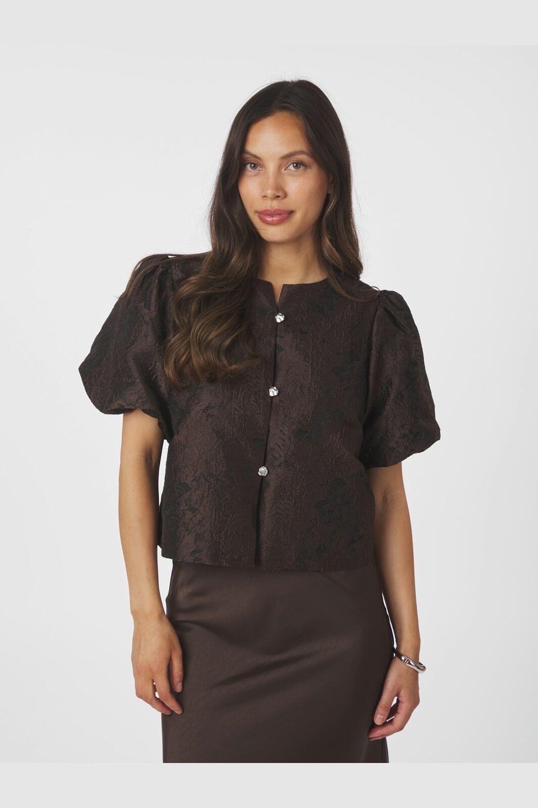 Blouse marron foncé de Neo Noir en tissu brocart structuré avec motif floral. La blouse a des manches bouffantes et une fermeture à boutons à l'avant, ce qui la rend utilisable comme une petite veste.