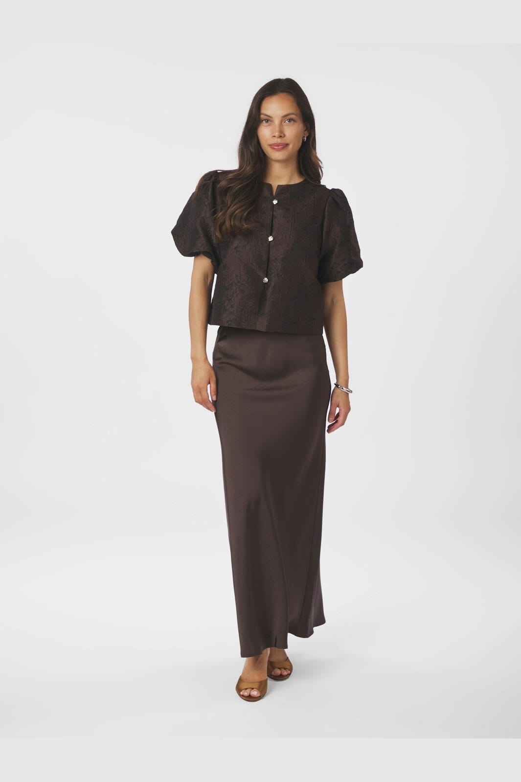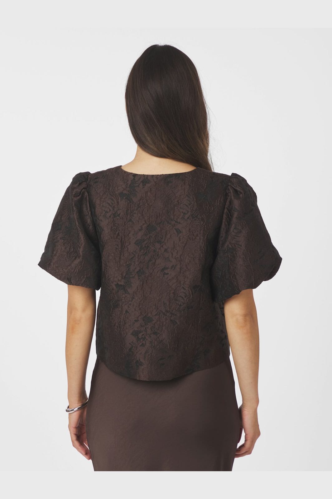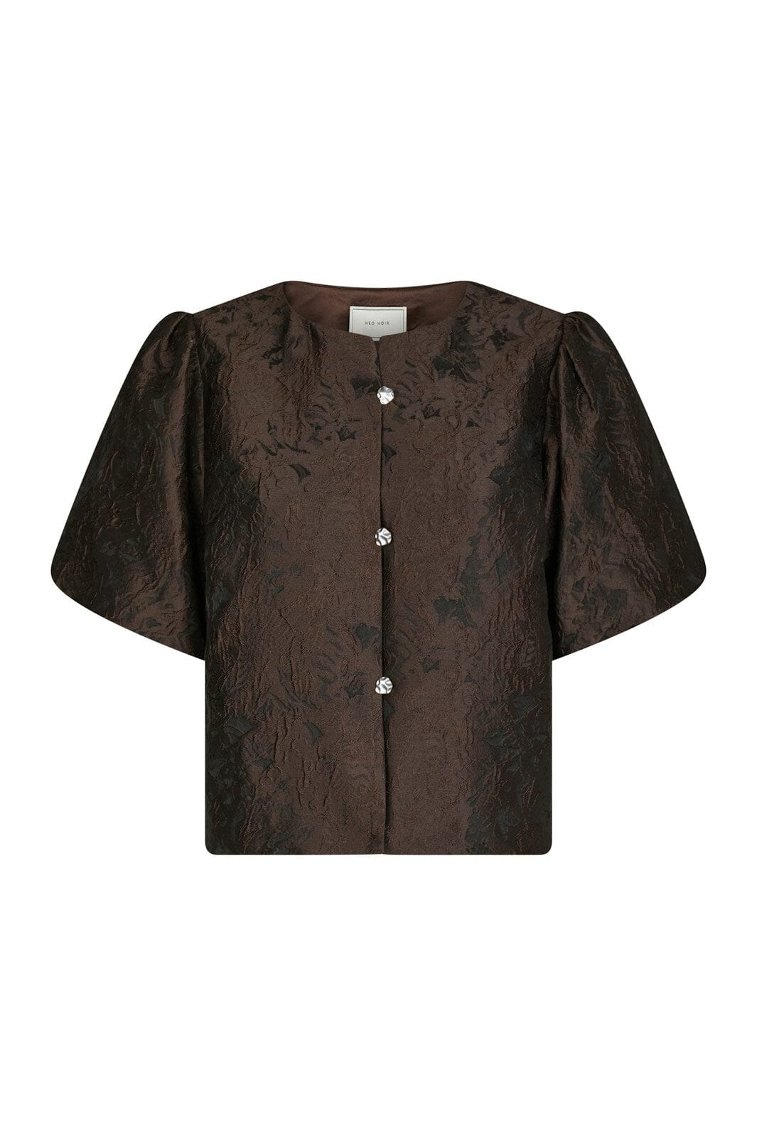 Blouse marron foncé de Neo Noir en tissu brocart structuré avec motif floral. La blouse a des manches bouffantes et une fermeture à boutons à l'avant, ce qui la rend utilisable comme une petite veste.