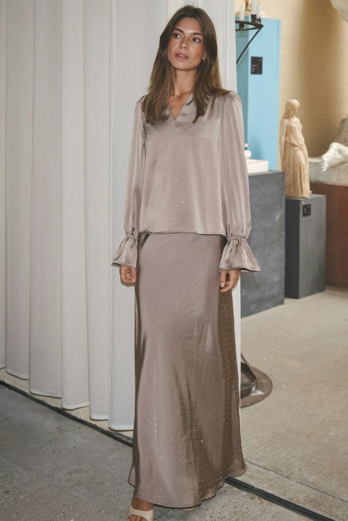Blouse en satin brun de Neo Noir avec motif à pois et paillettes. La blouse a un décolleté en V avec des détails froncés et des manches longues avec des volants aux poignets.