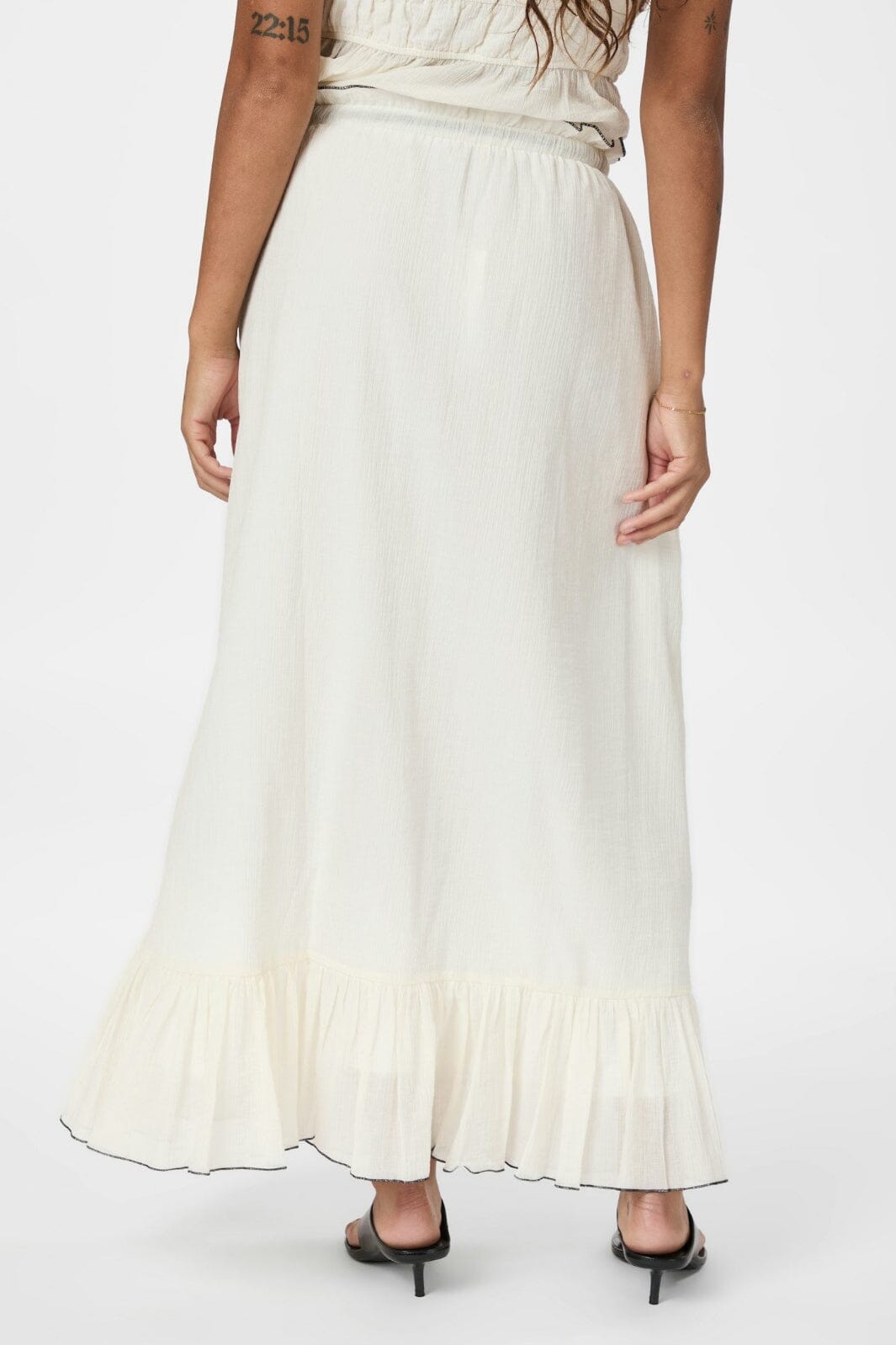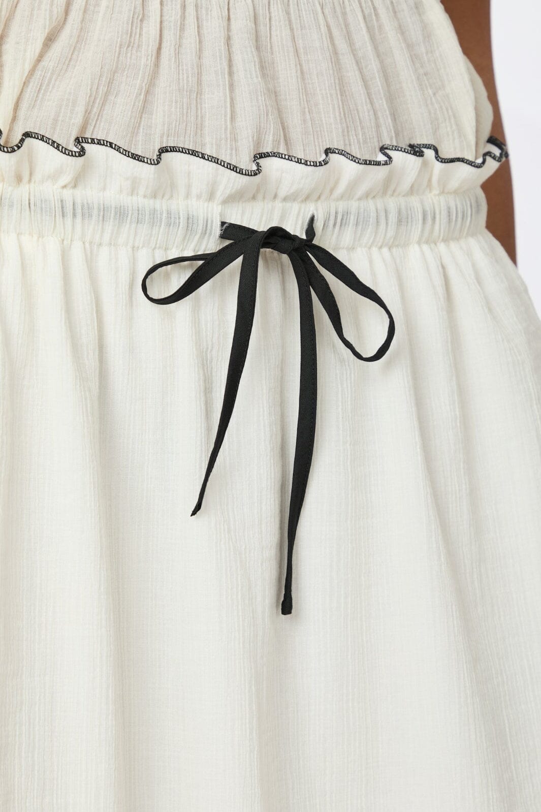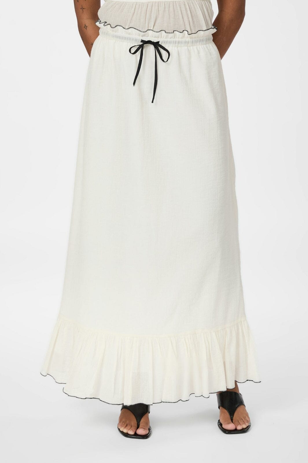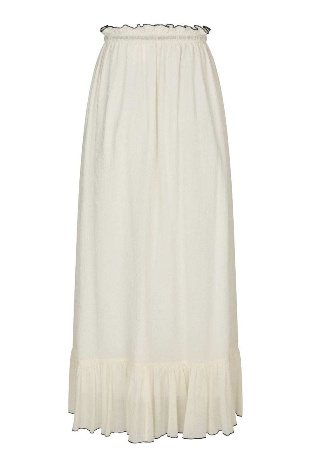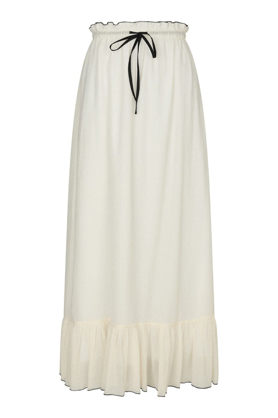Jupe couleur crème de Neo Noir en qualité crêpe légère. Elle a un volant en bas et un lien noir à la taille qui crée un contraste avec la couleur claire.