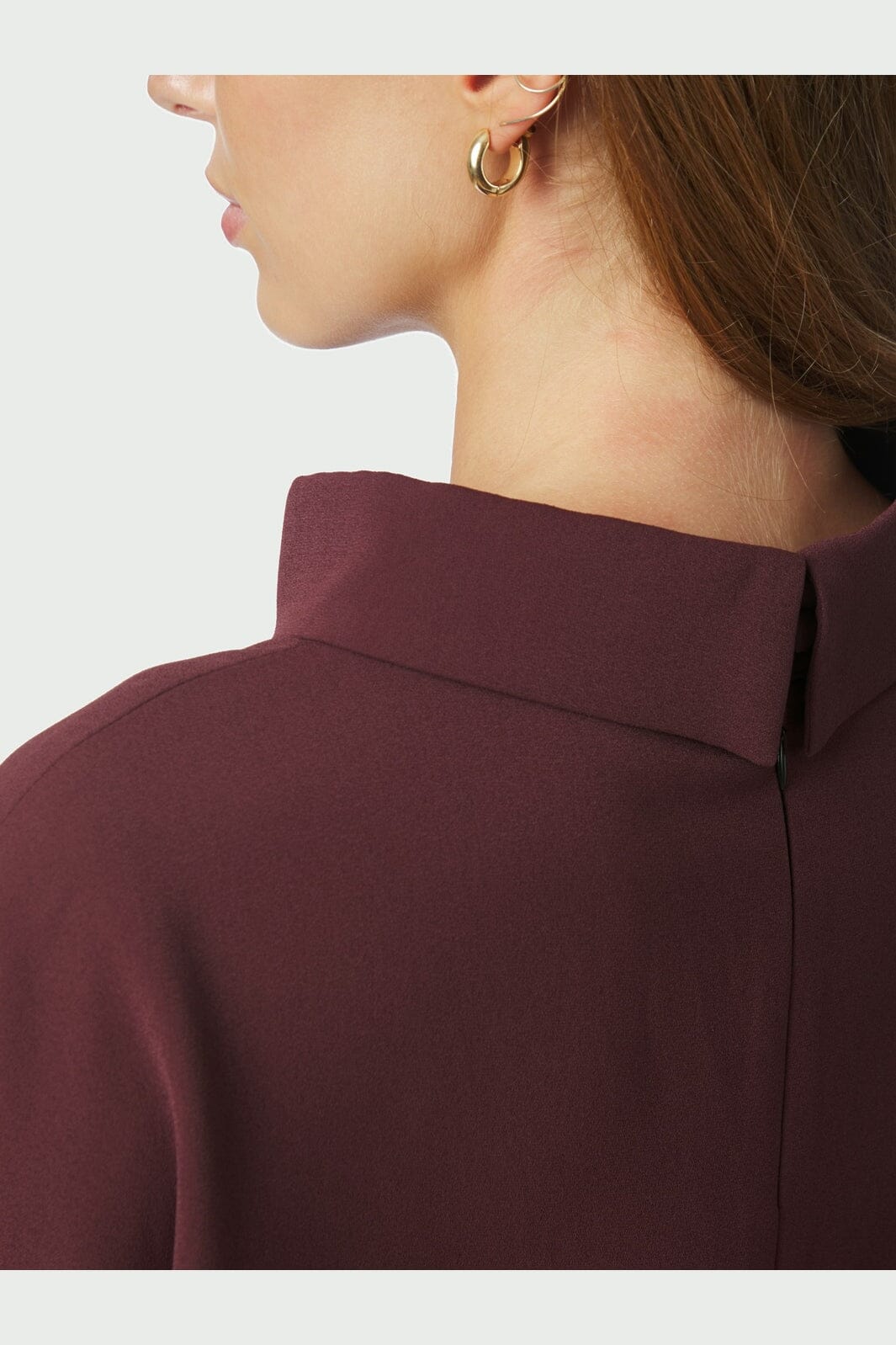 Jumpsuit bordeaux de Neo Noir en qualité crêpe douce. Il a des jambes larges, des poches pratiques et un col montant. La fermeture éclair dans le dos facilite l'enfilage et le retrait.