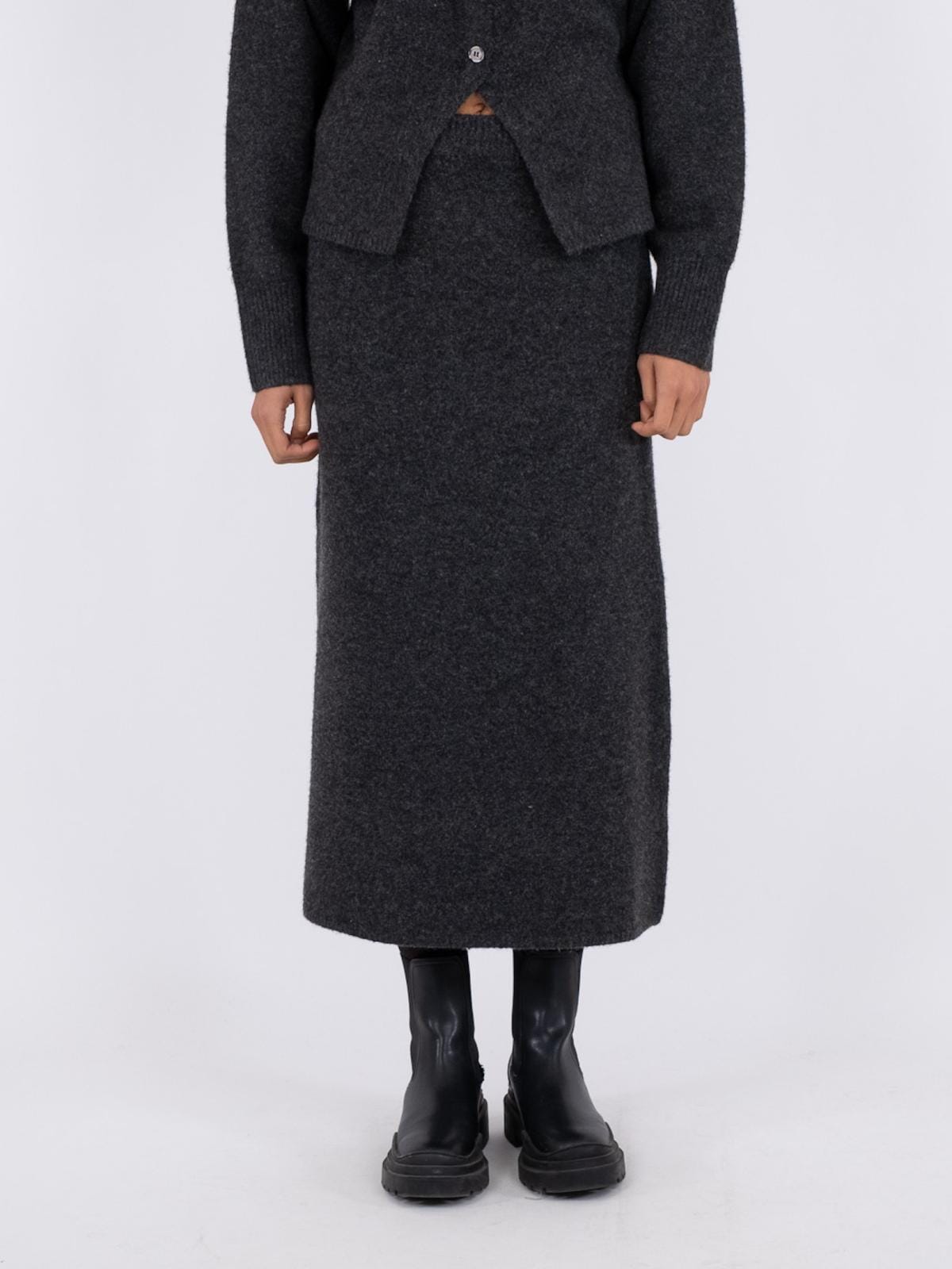 Jupe tricotée de Neo Noir en anthracite. La couleur gris foncé et la silhouette droite la rendent facile à styliser avec différentes pièces supérieures. La jupe a une taille élastique et arrive au milieu du mollet.